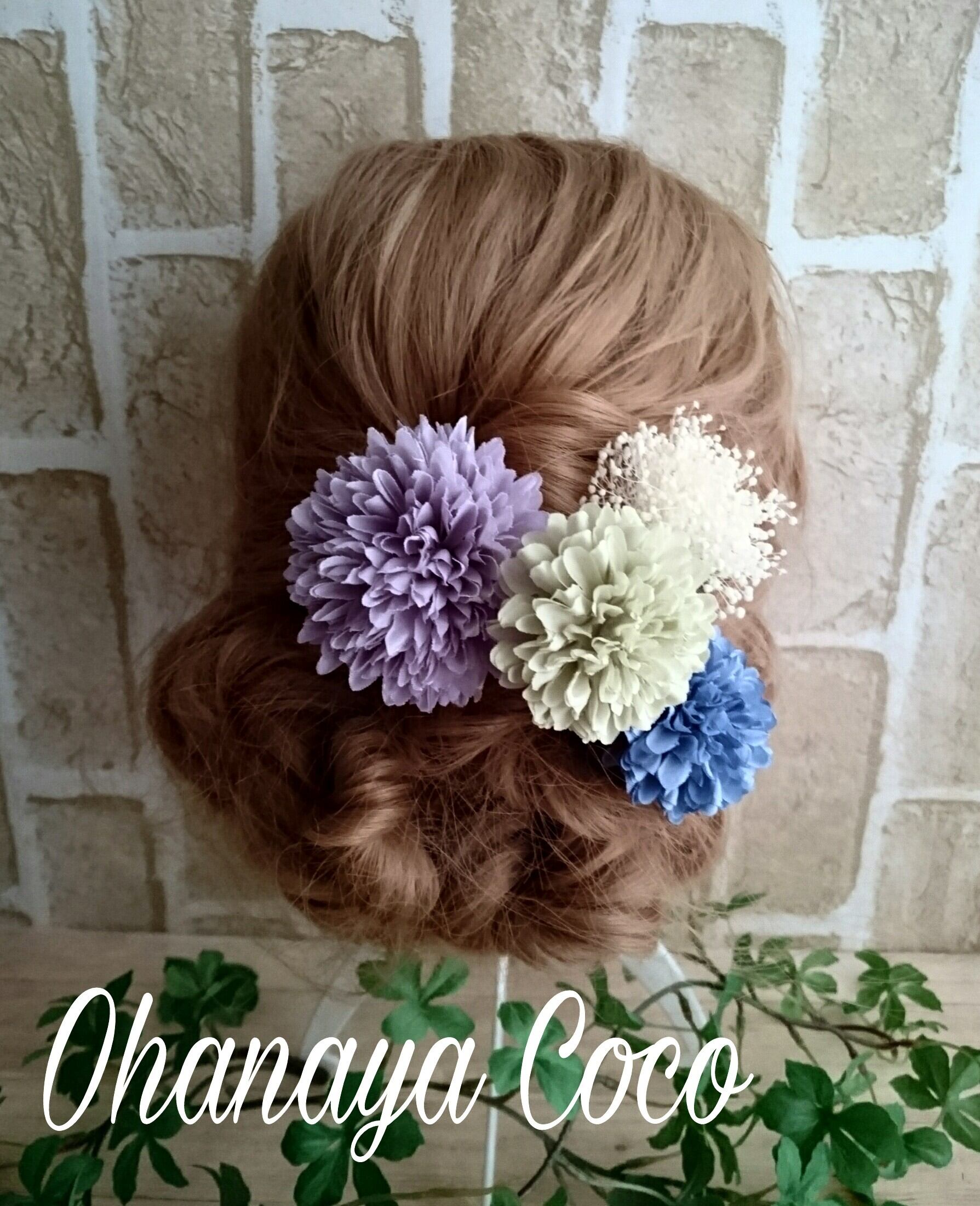 清涼〜かすみ草とマムの和装髪飾り4点Set No207 ⑤ 浴衣