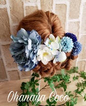 こちらの商品は青系 芍薬とマムの髪飾り7点Setです。