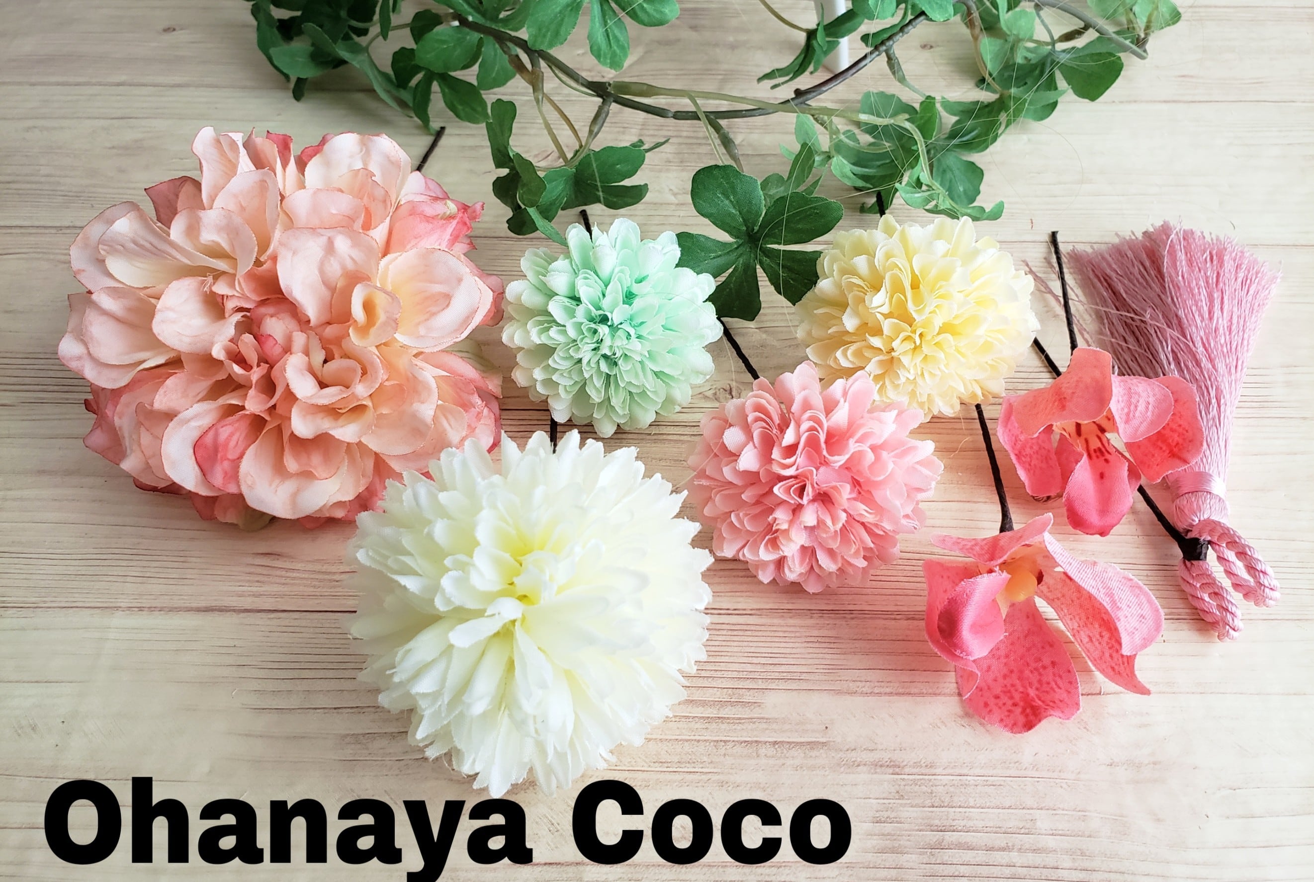 こちらの商品は花舞うピーチダリアとマムの髪飾り8点Setです。。