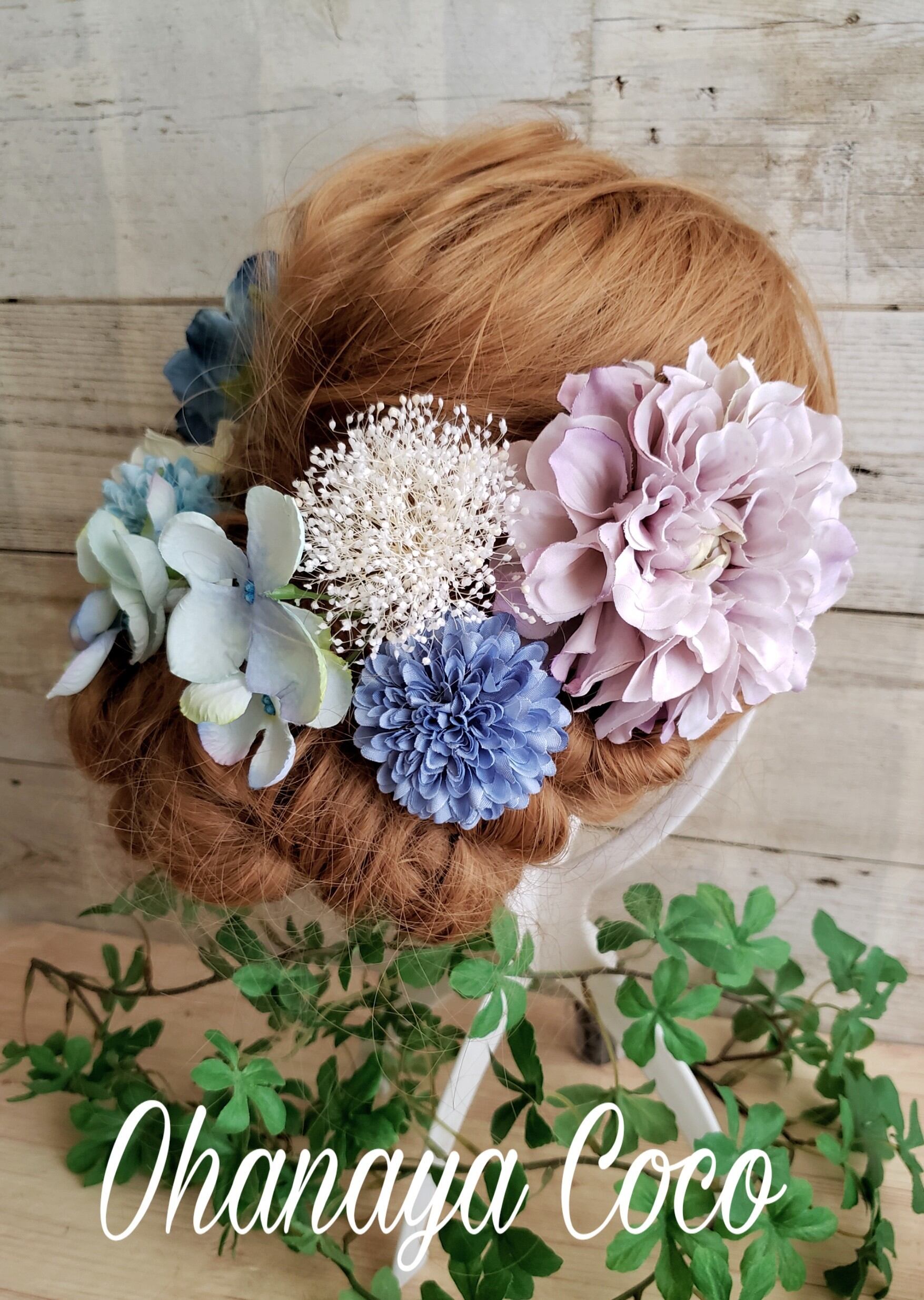青系 芍薬とマムの髪飾り7点Set