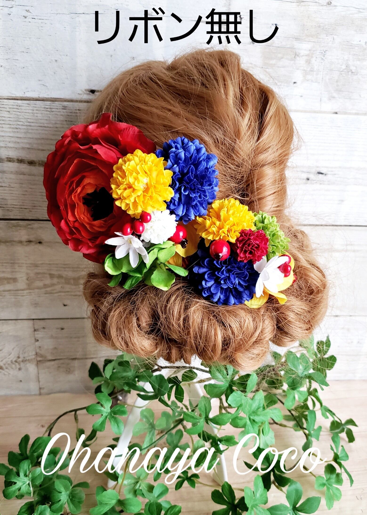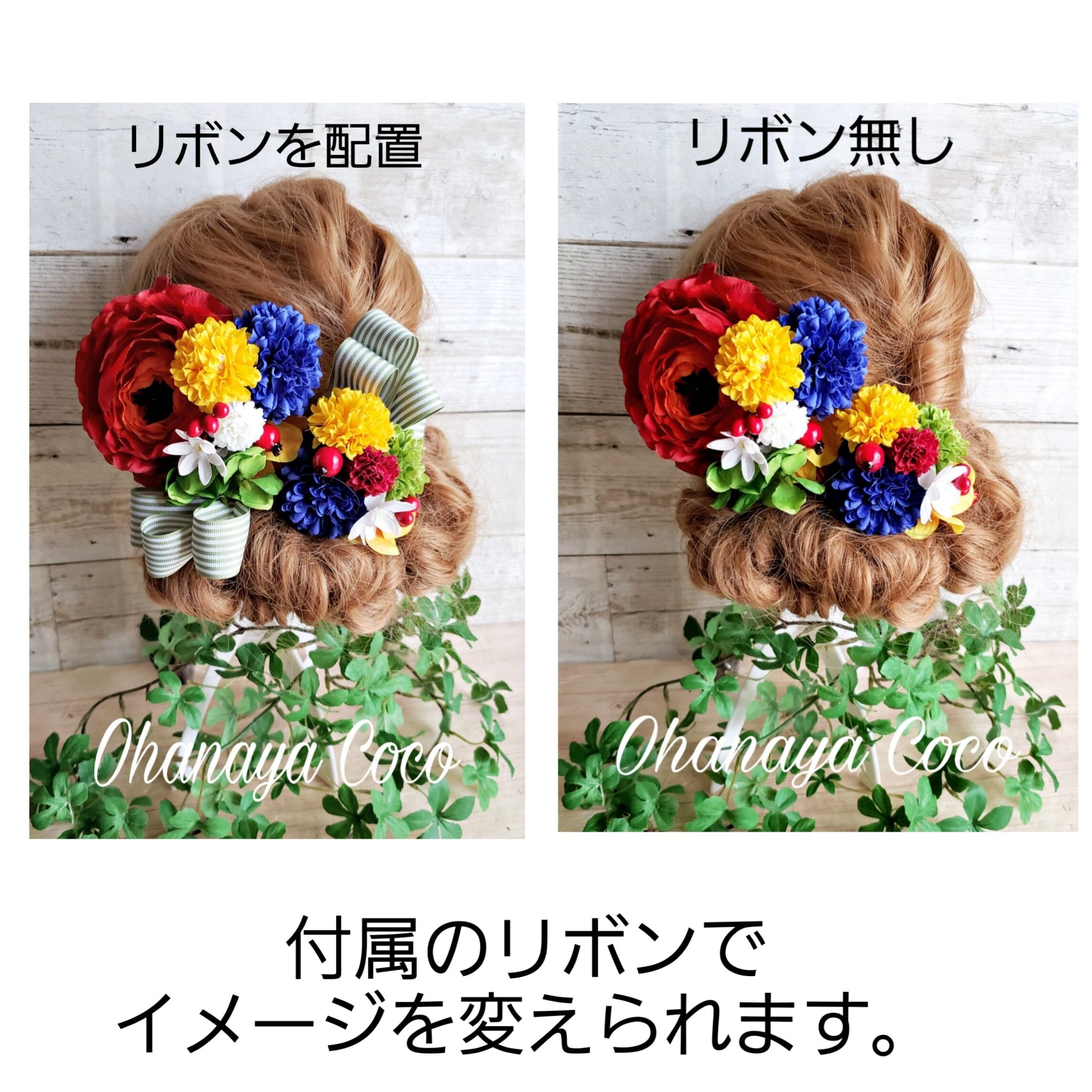 ハッキリした色合いの振袖、浴衣、袴など和風モダン系にもピッタリです。付属のリボンで雰囲気を変える事も出来ます。