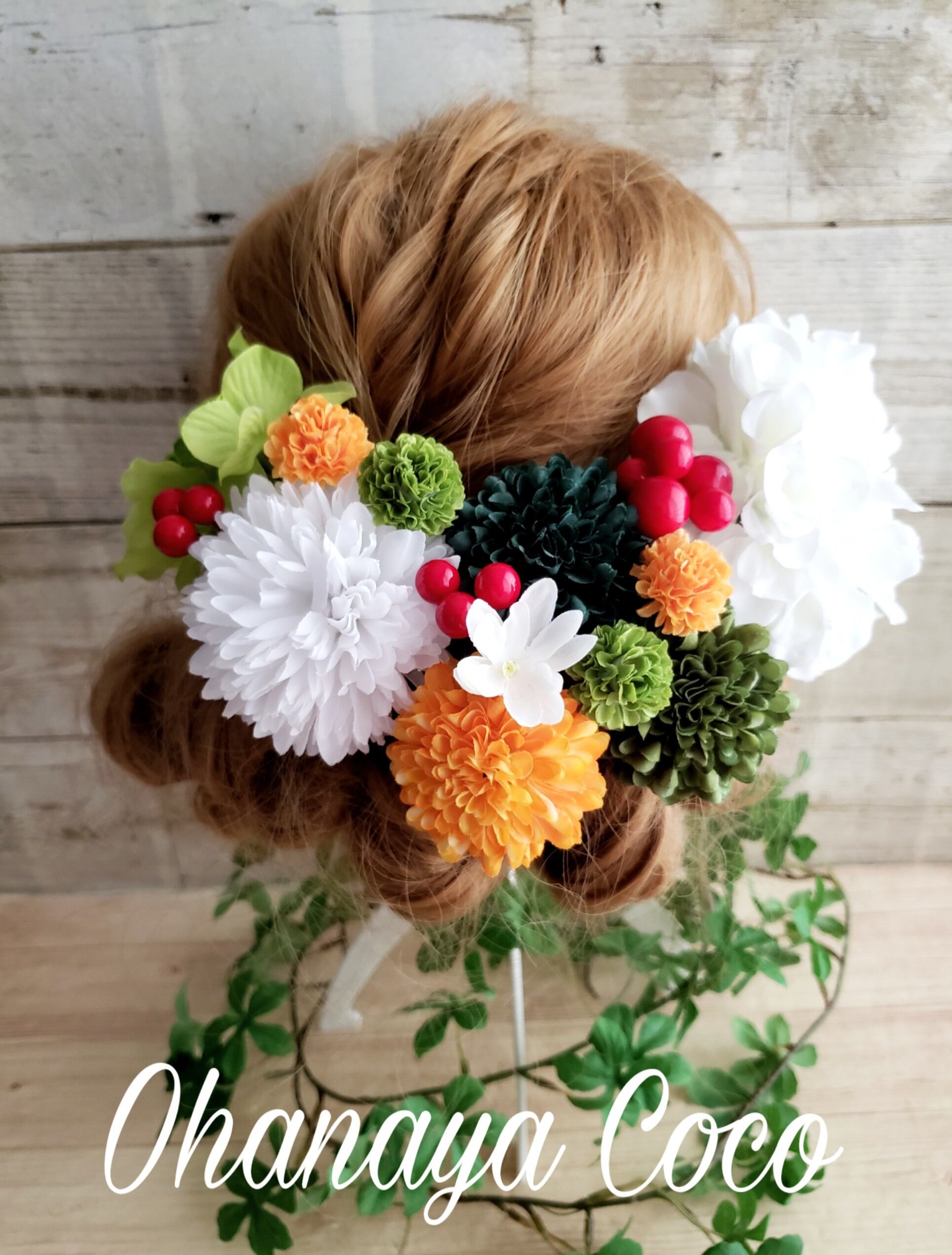 こちらの商品は新緑 ダリアとマムの髪飾り14点Setです。