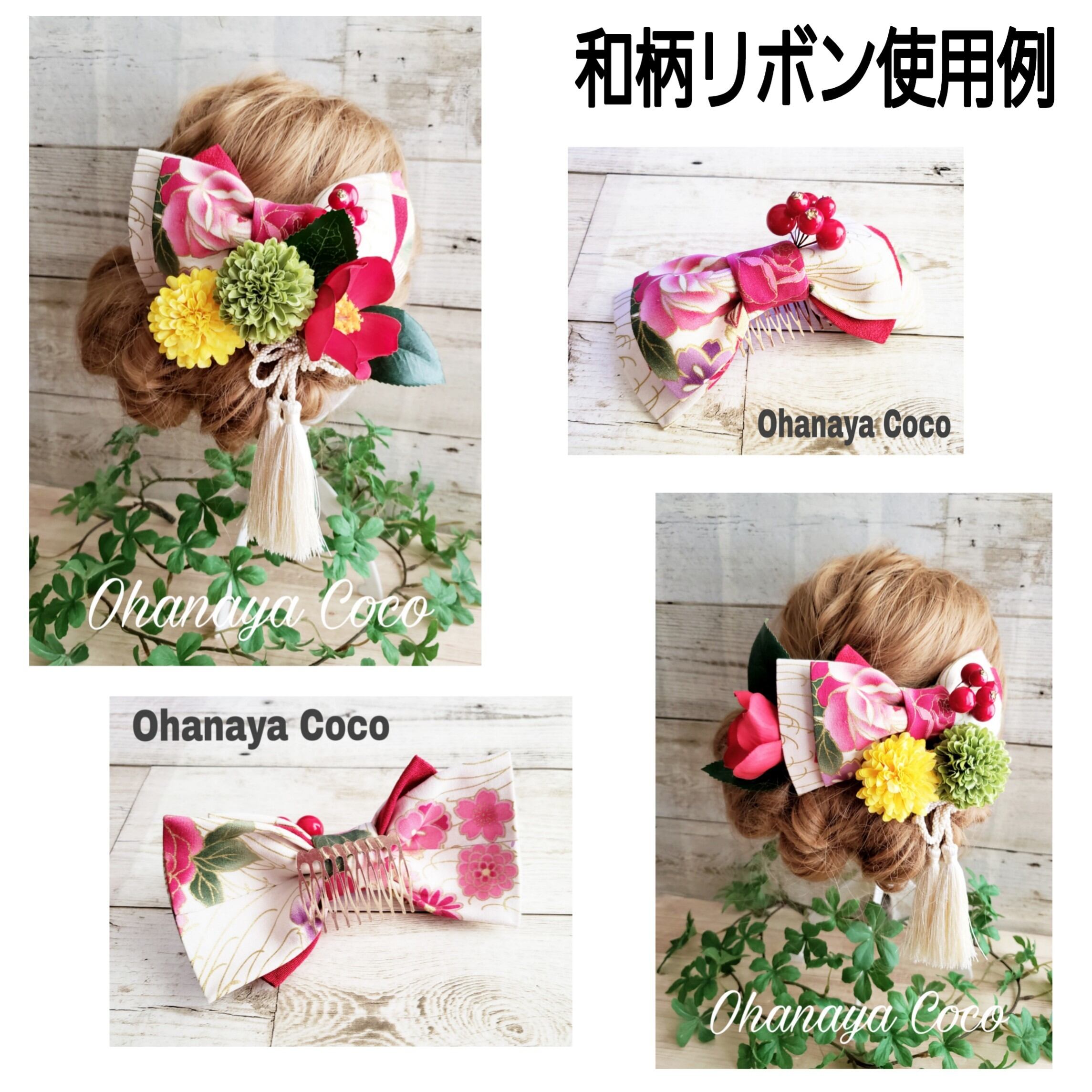 白地にピンクの芍薬の和柄生地と赤いちりめん生地3枚を組合せたボリュームたっぷりの張りのあるリボンになります。