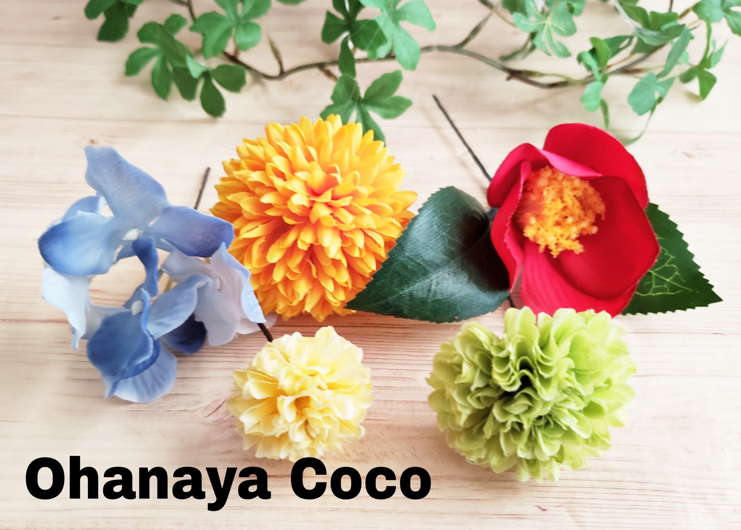 こちらの商品は早春椿とポンポンマムの髪飾り5点Setです。