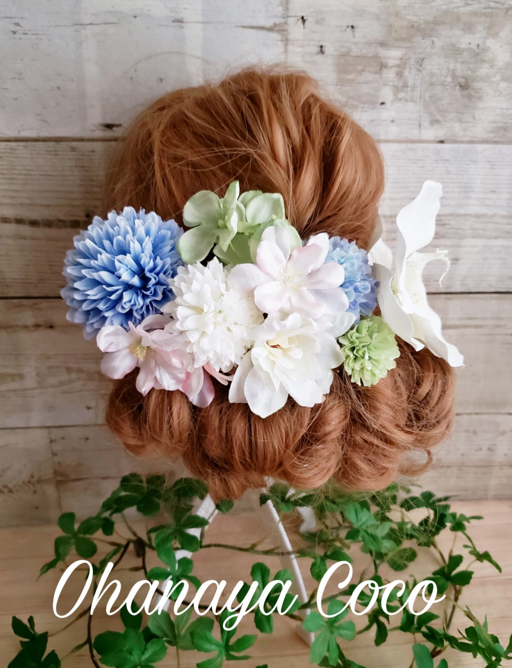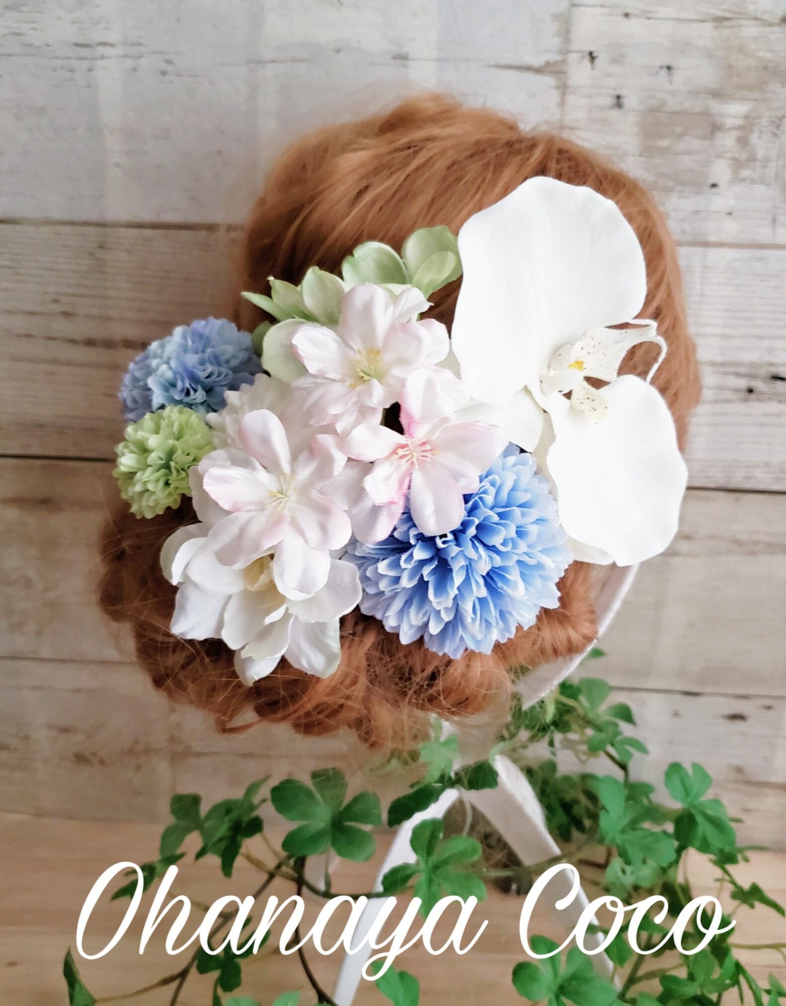 funwari 白い胡蝶蘭と水色ポンポンマムの髪飾り10点Set オーダー