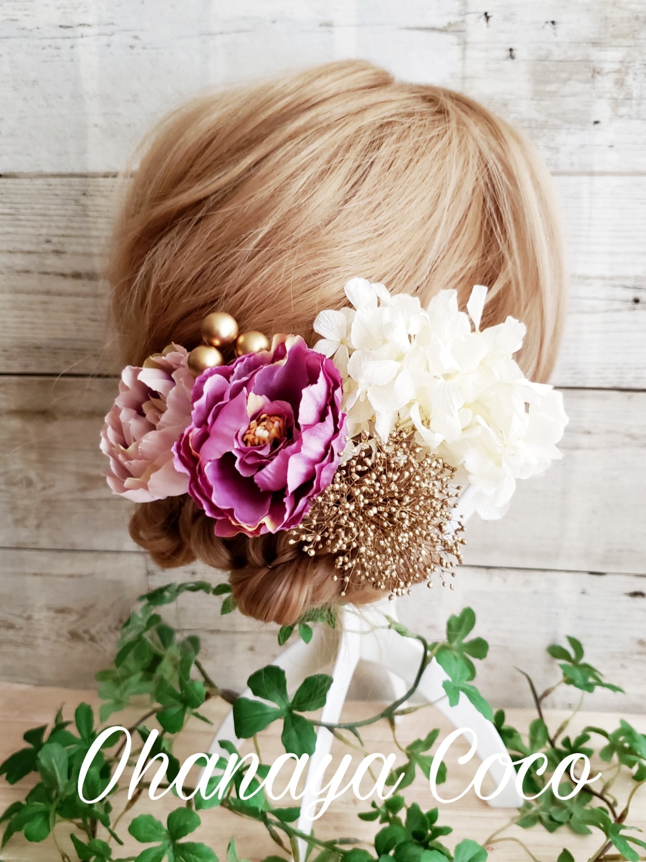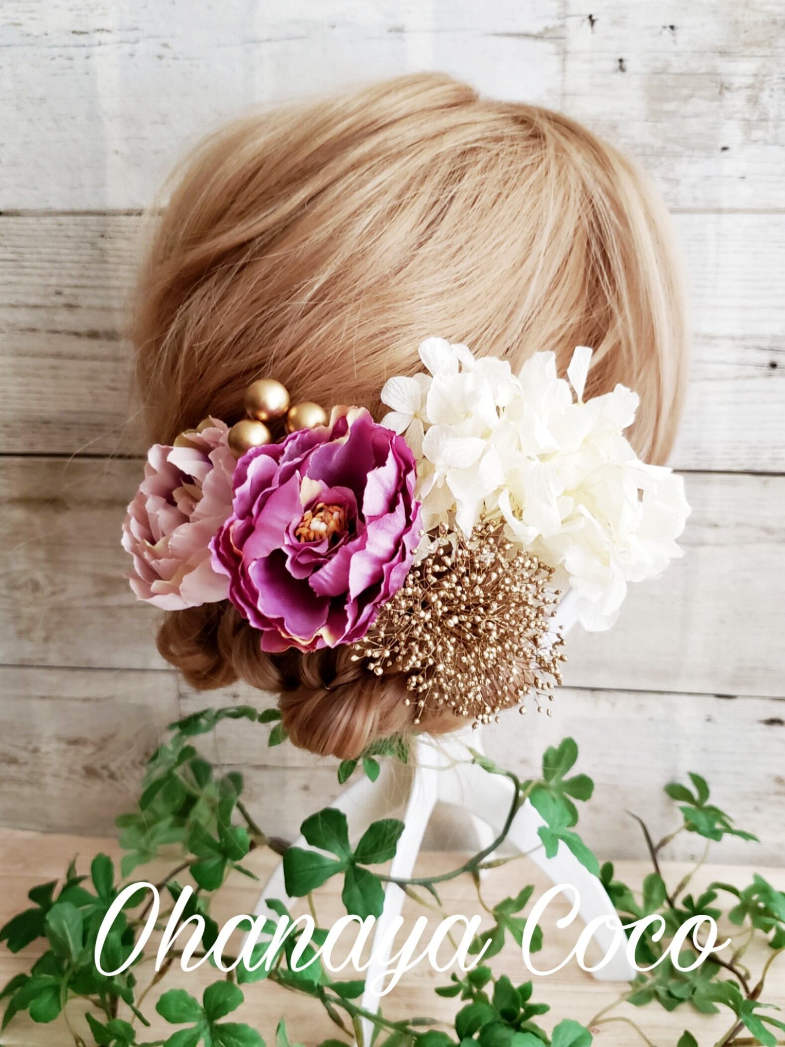 こちらの商品は本物のお花 プリザ紫陽花とかすみ草ゴールドの髪飾り5点Setです。