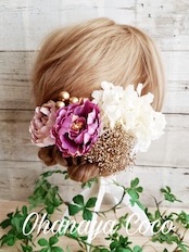 本物のお花のプリザーブドフラワーの紫陽花とかすみ草、造花のアンティーク風ローズを使用した高級感のある大人な雰囲気が素敵な髪飾りです。