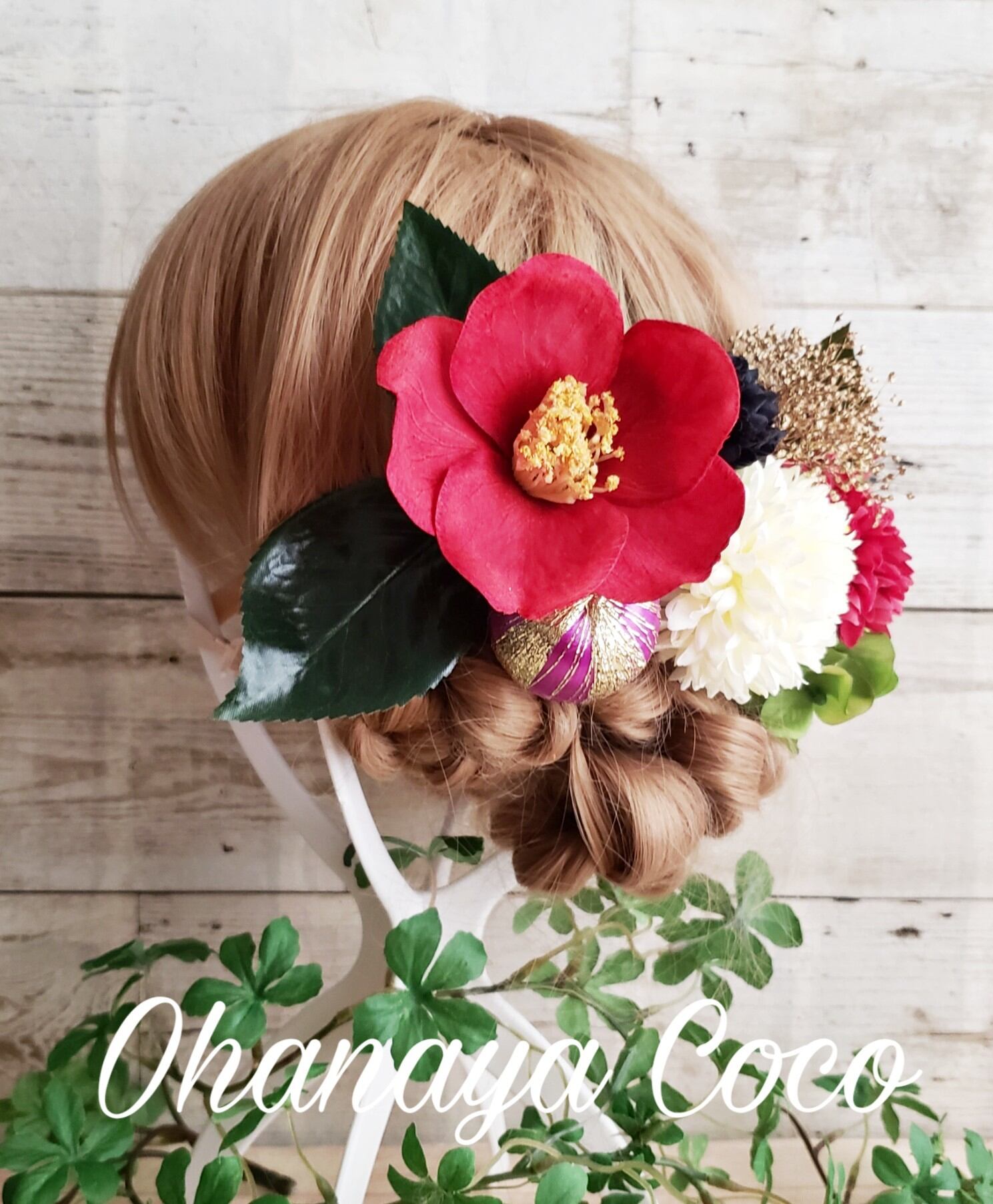 また、撮影角度などにより大きく見える場合もありますので実際の髪飾りの大きさは記載のサイズをご確認下さいませ