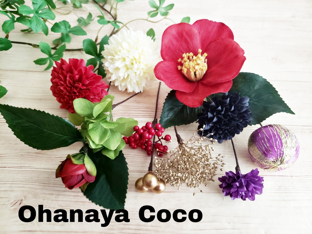 花雅 江戸椿と金糸ボールの髪飾り11点Set No423