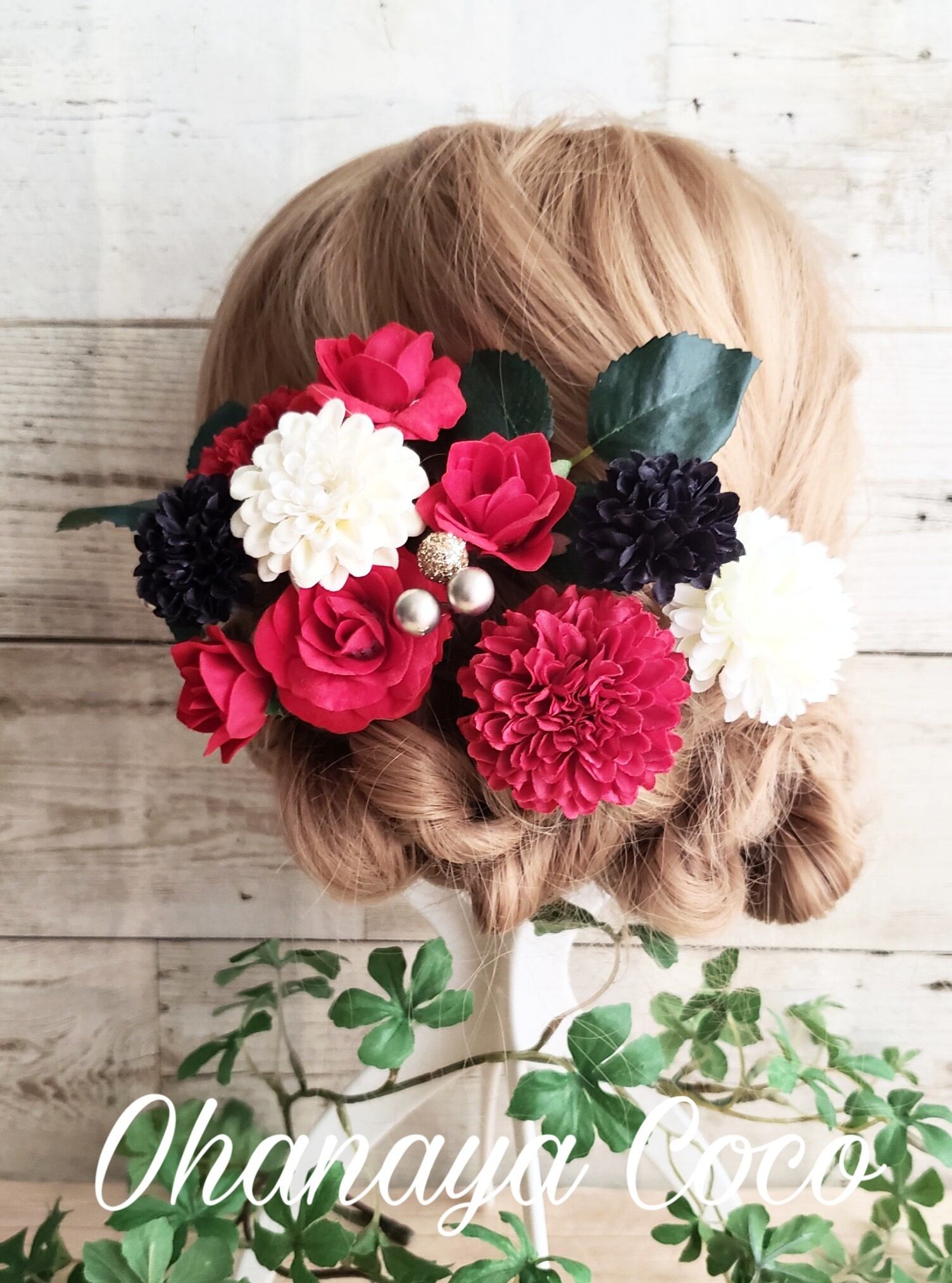 こちらの商品は麗姫 真っ赤な薔薇と黒マムの髪飾り14点Setです。
