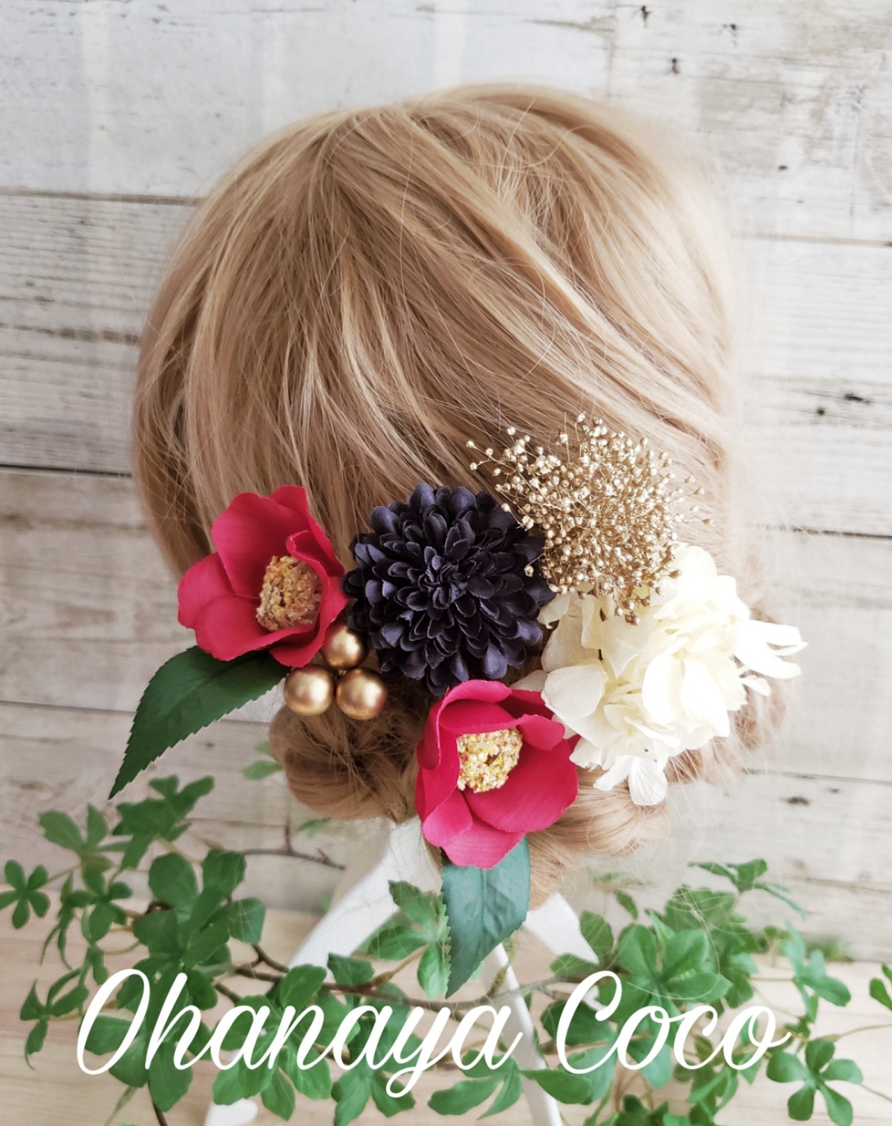 こちらの商品は椿とゴールドかすみ草の髪飾り6点Set です。