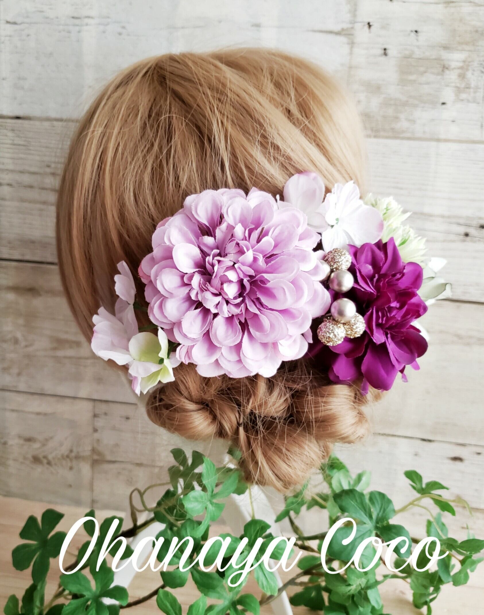 こちらの商品は艶姫 パープル系ダリアと紫陽花の髪飾り8点Setです。
