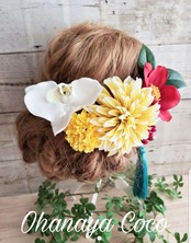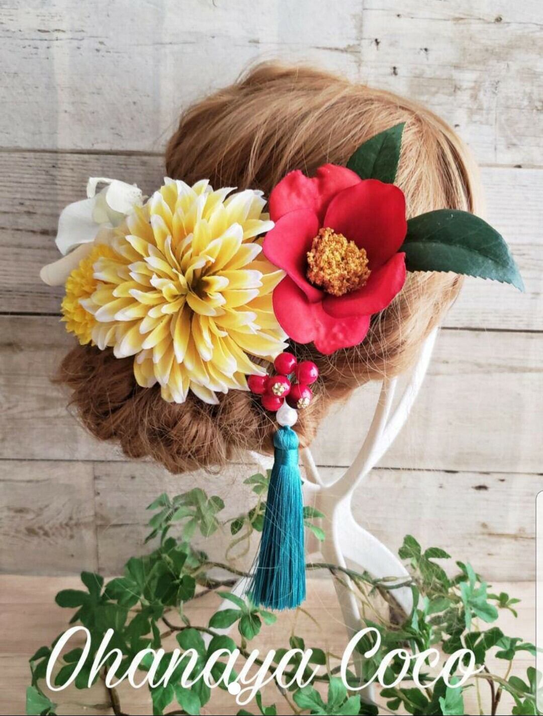 こちらの商品は花開く 椿と黄色ダリアの髪飾り6点Setです。