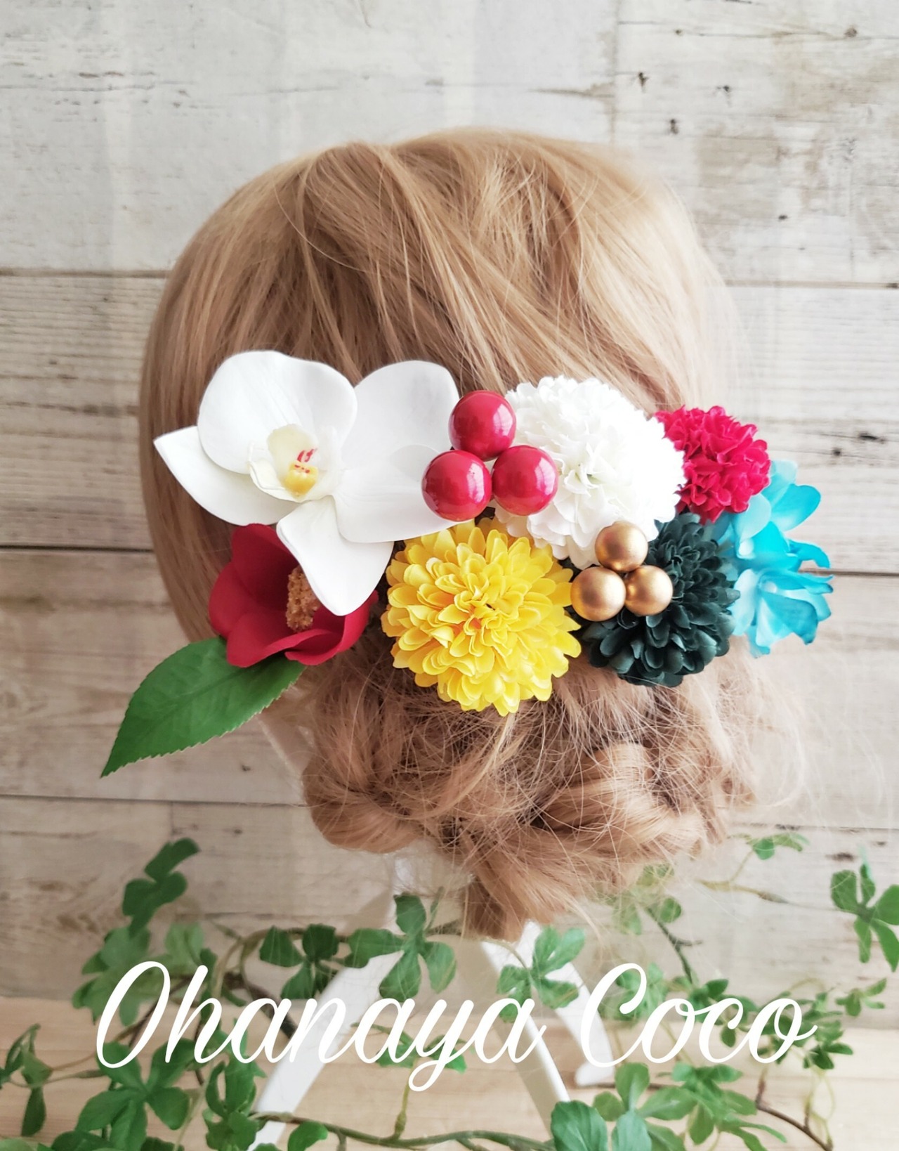 こちらの商品は椿姫 hirahira 胡蝶蘭とマムの髪飾り9点Setです。