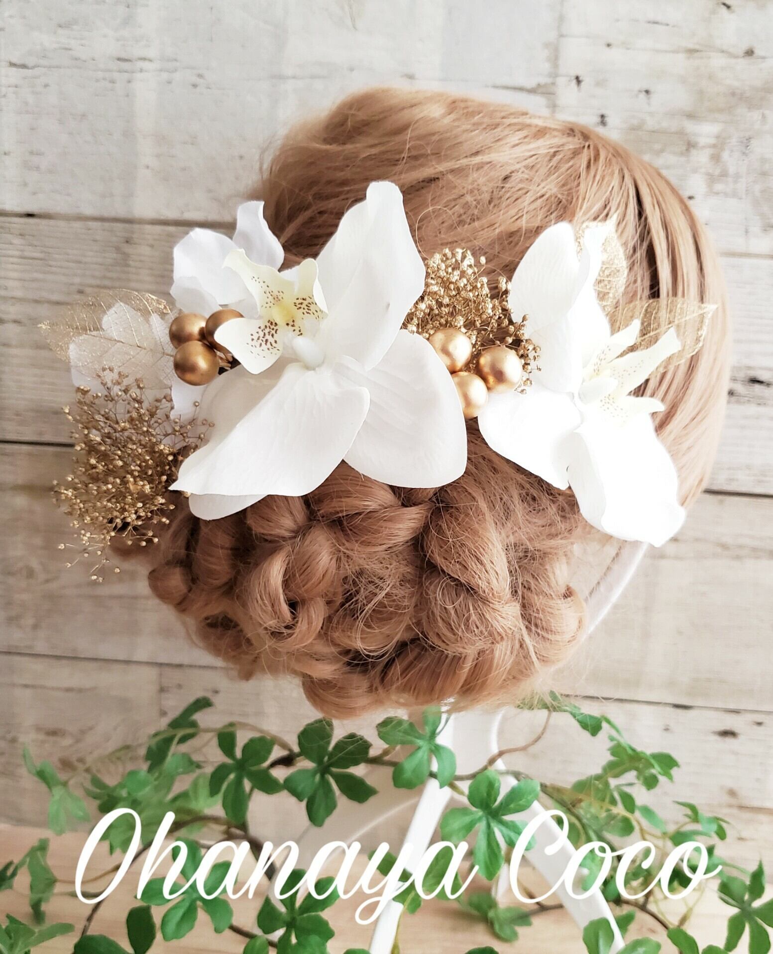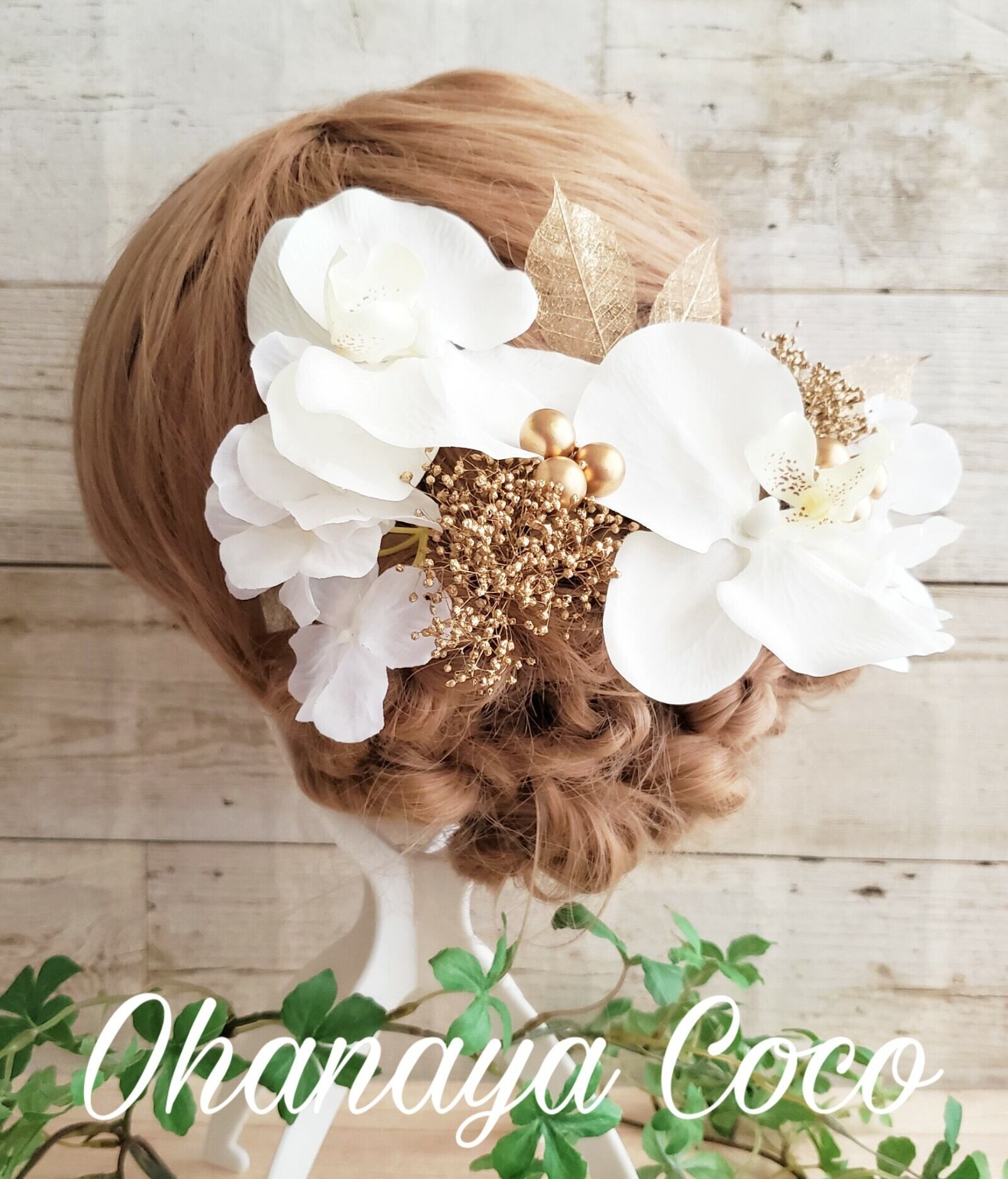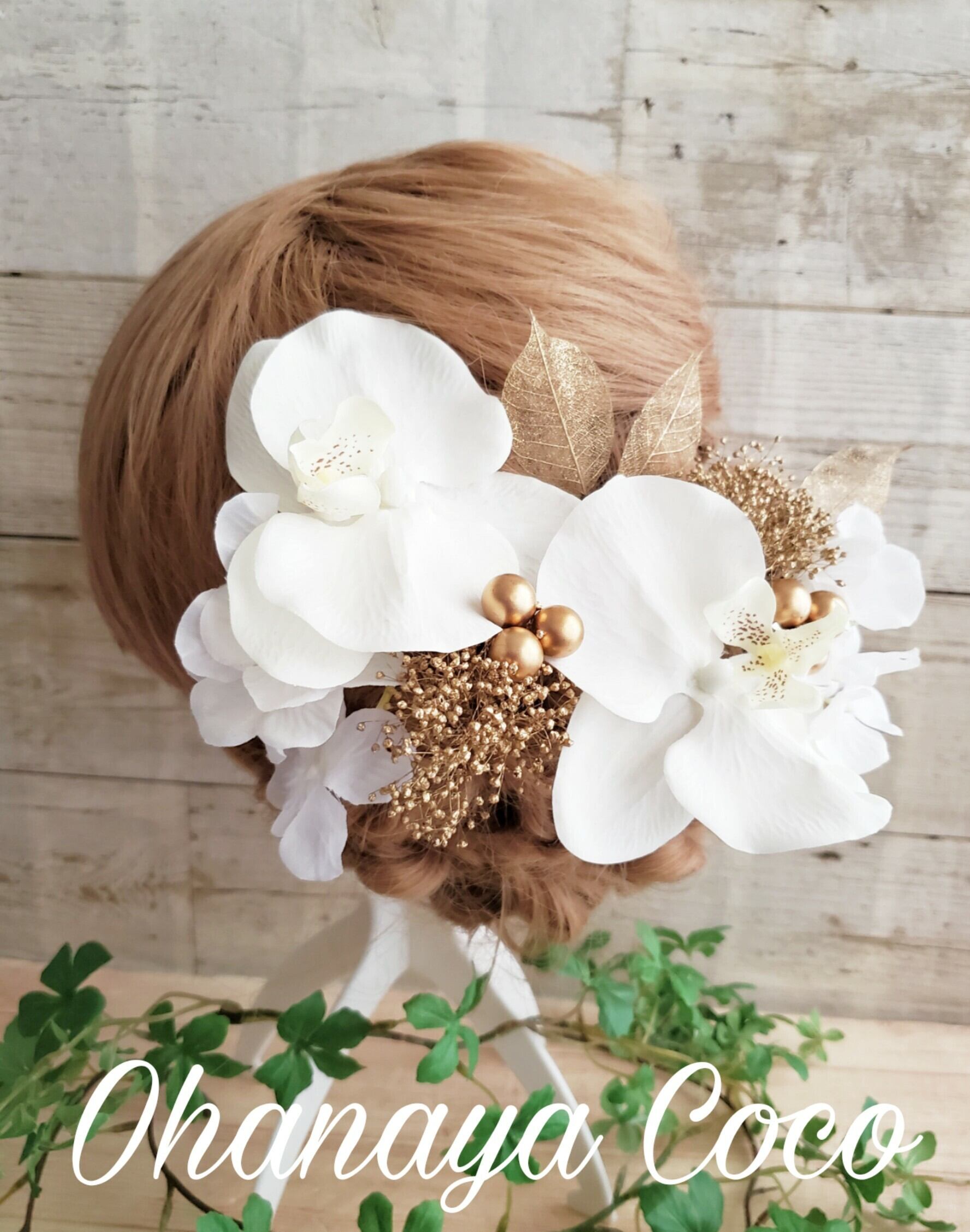 本物のお花のプリザーブドフラワーかすみ草とゴールドリーフ、アーティフィシャルフラワー(造花)の胡蝶蘭と紫陽花を使用した高級感のある大人な雰囲気が素敵な髪飾りです。