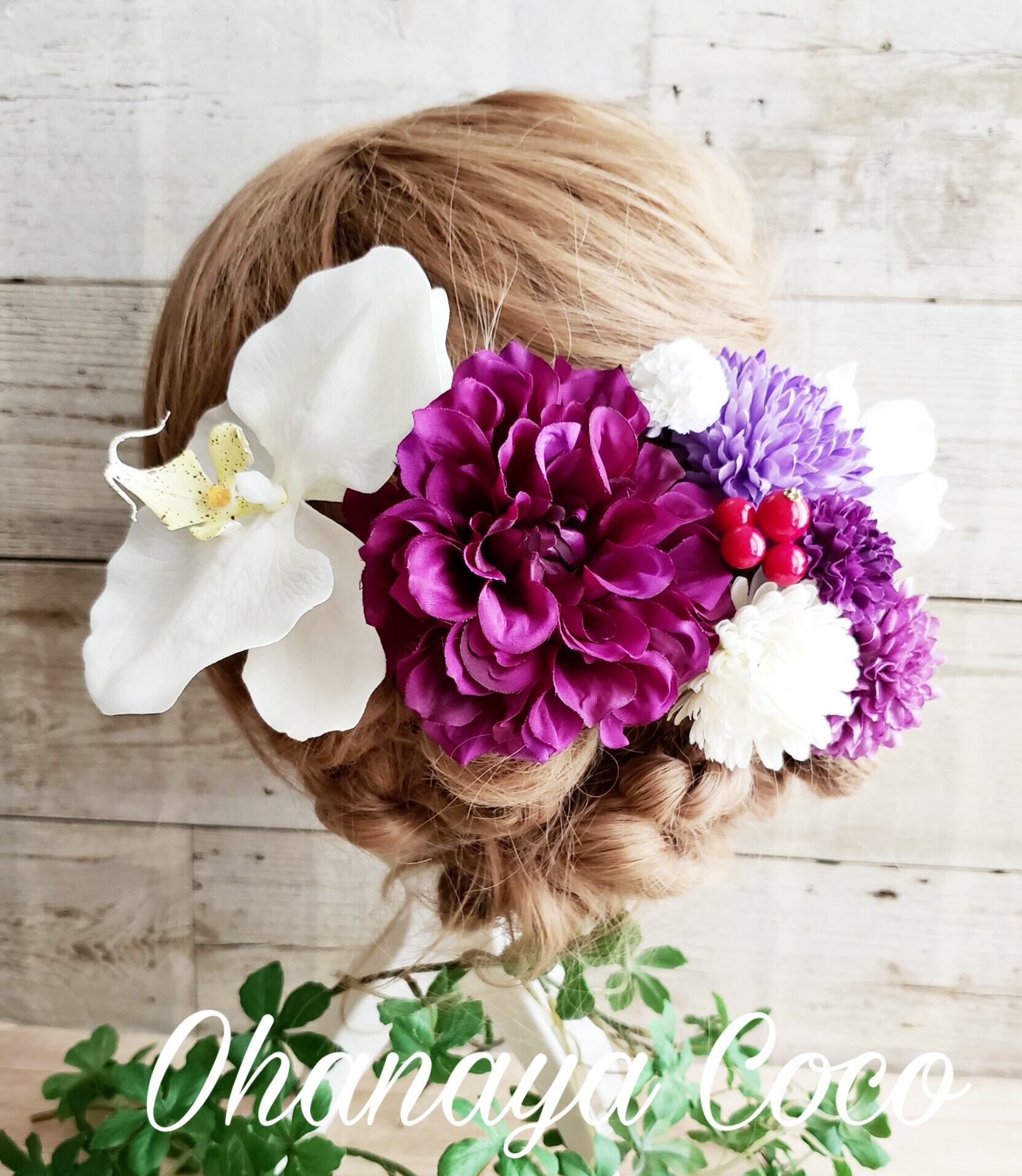 こちらの商品はhirahira 胡蝶蘭とダリアのパープル系髪飾り9点Setです。