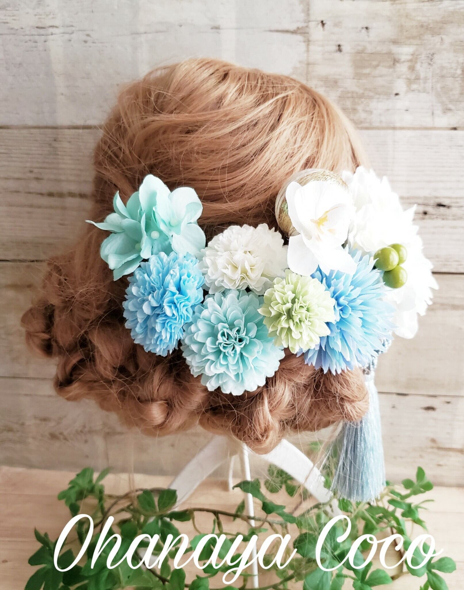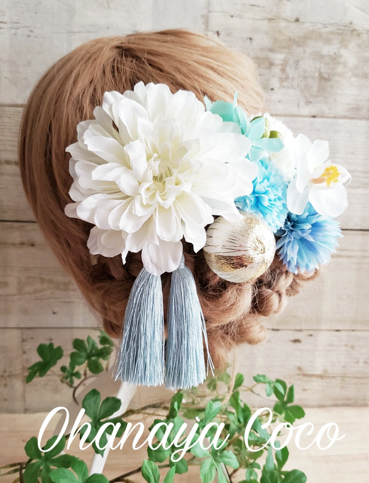 こちらの商品は花雫 真っ白ダリアと水色マムの髪飾り11点Setです。