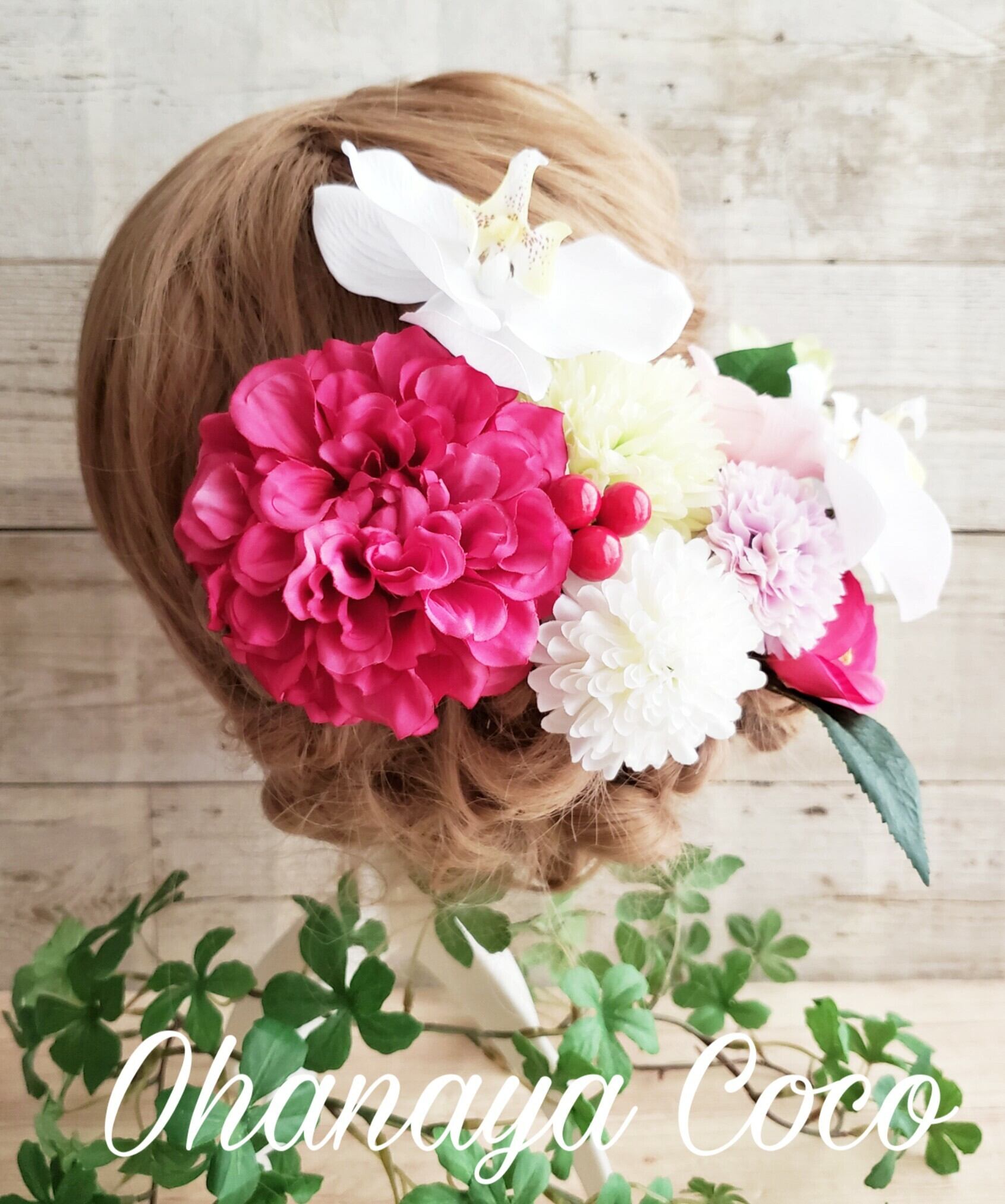 こちらの商品は甘花 ピンク系ダリアと胡蝶蘭の髪飾り10点Setです。