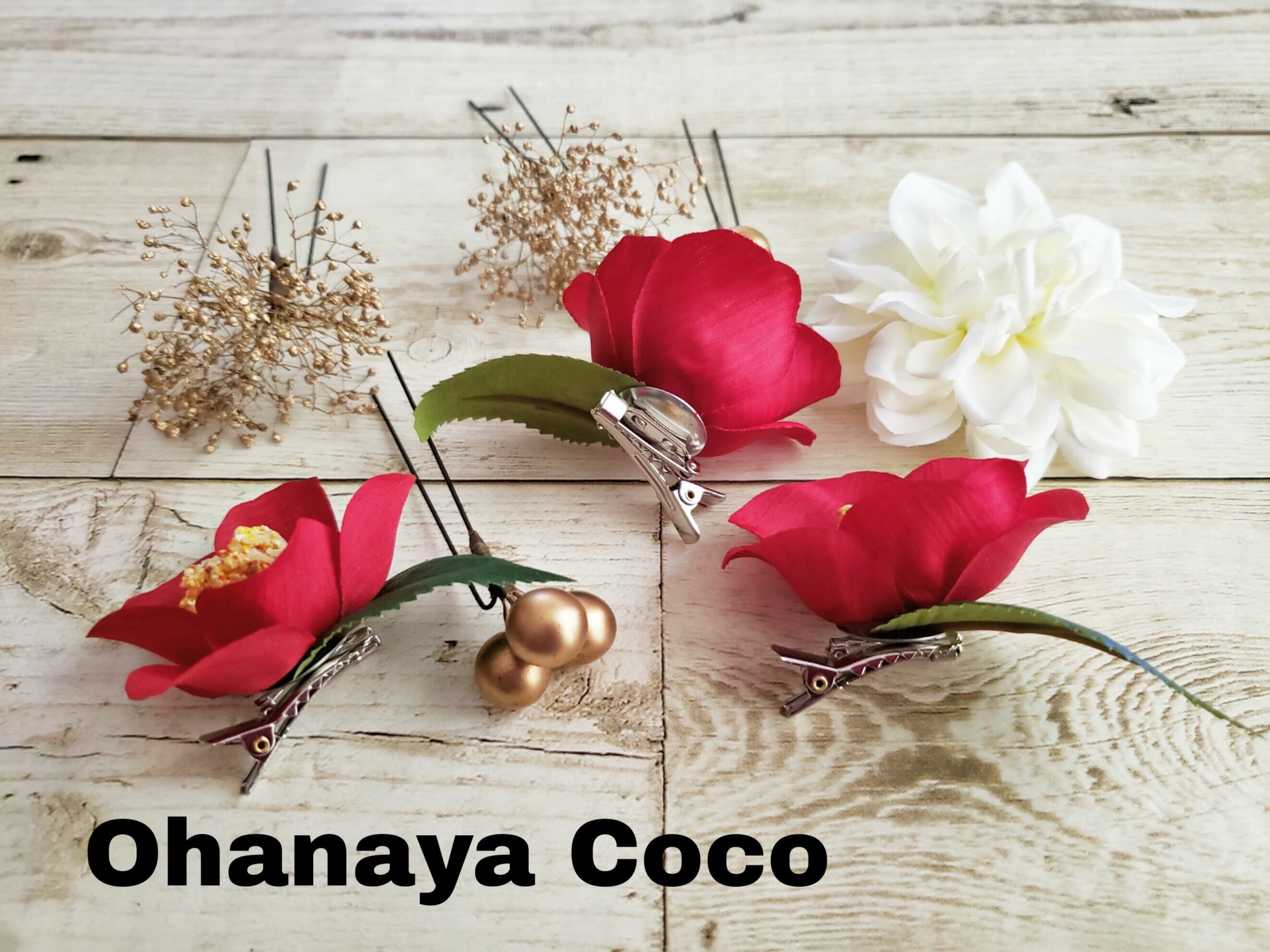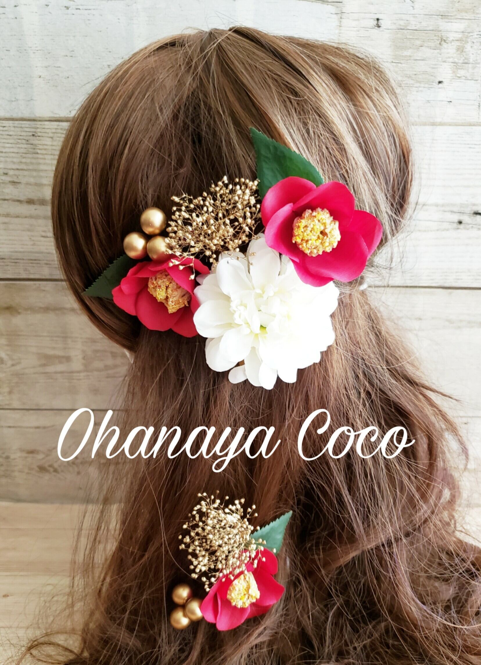 専用 ミニ椿とゴールドかすみ草の髪飾り8点Set 七五三お子様 クリップピン仕上げ