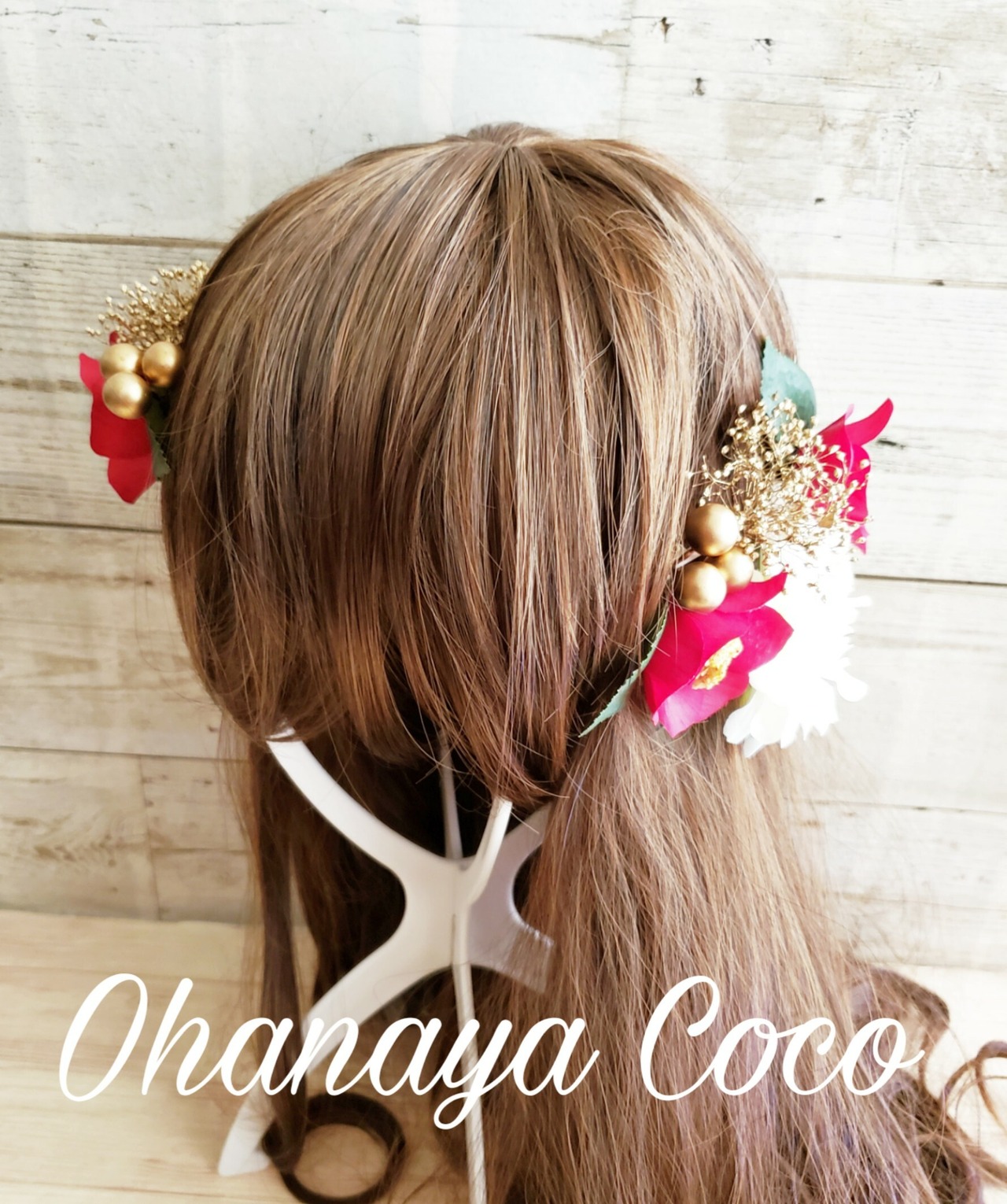 本物のお花のプリザーブドフラワーのかすみ草と造花の椿を使用した髪飾りです。