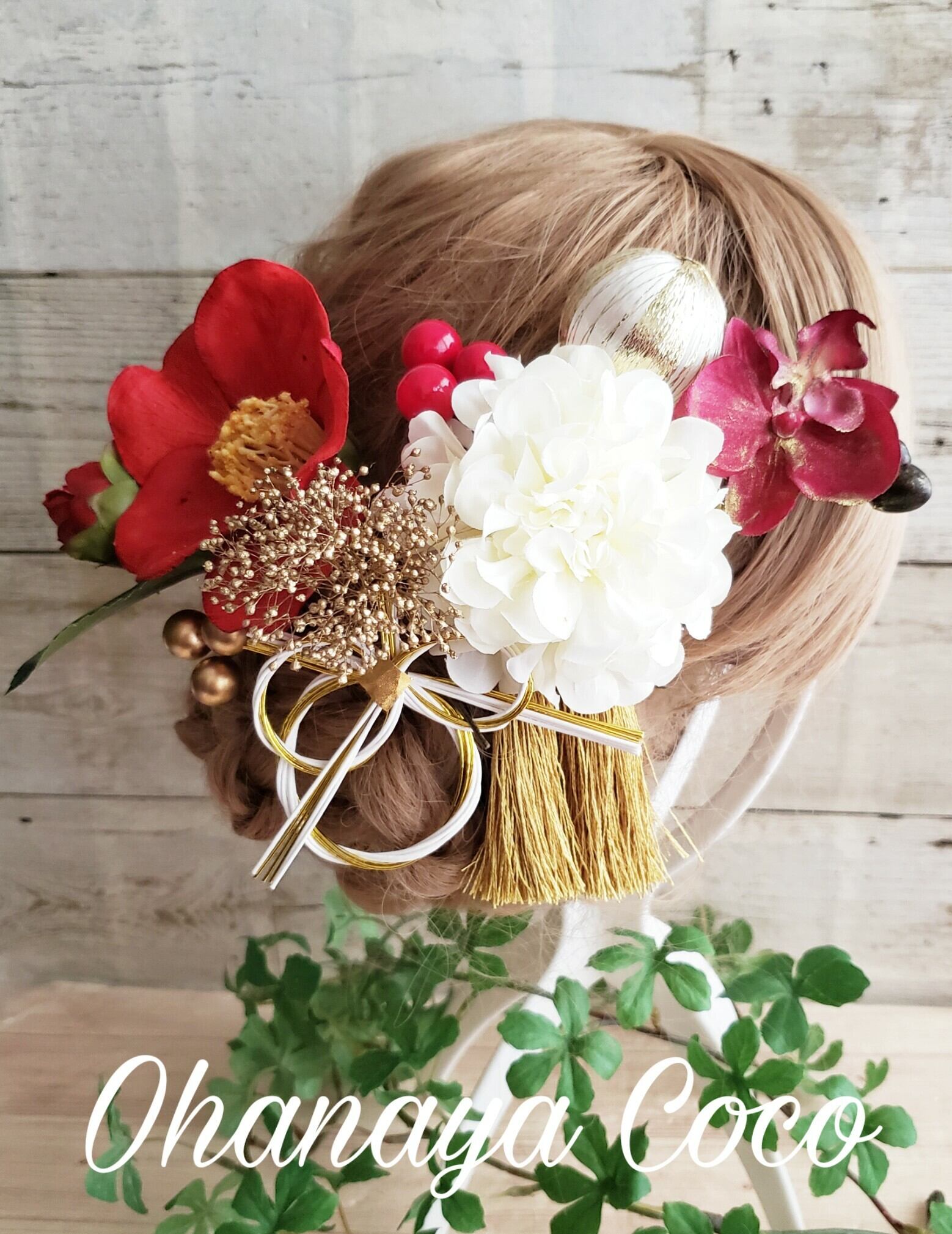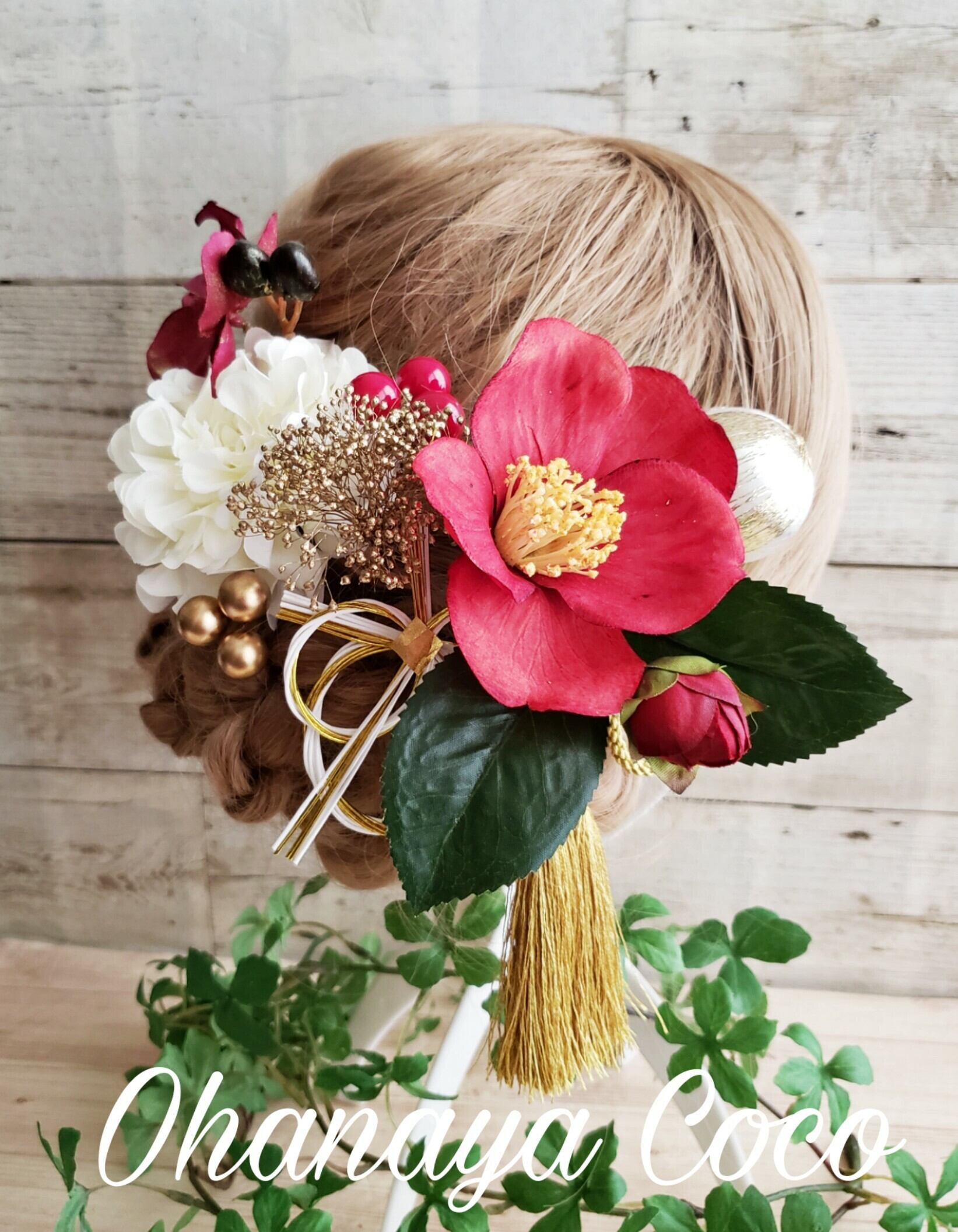 花雅 江戸椿とダリアの水引髪飾り9点Set➕紺タッセル追加
