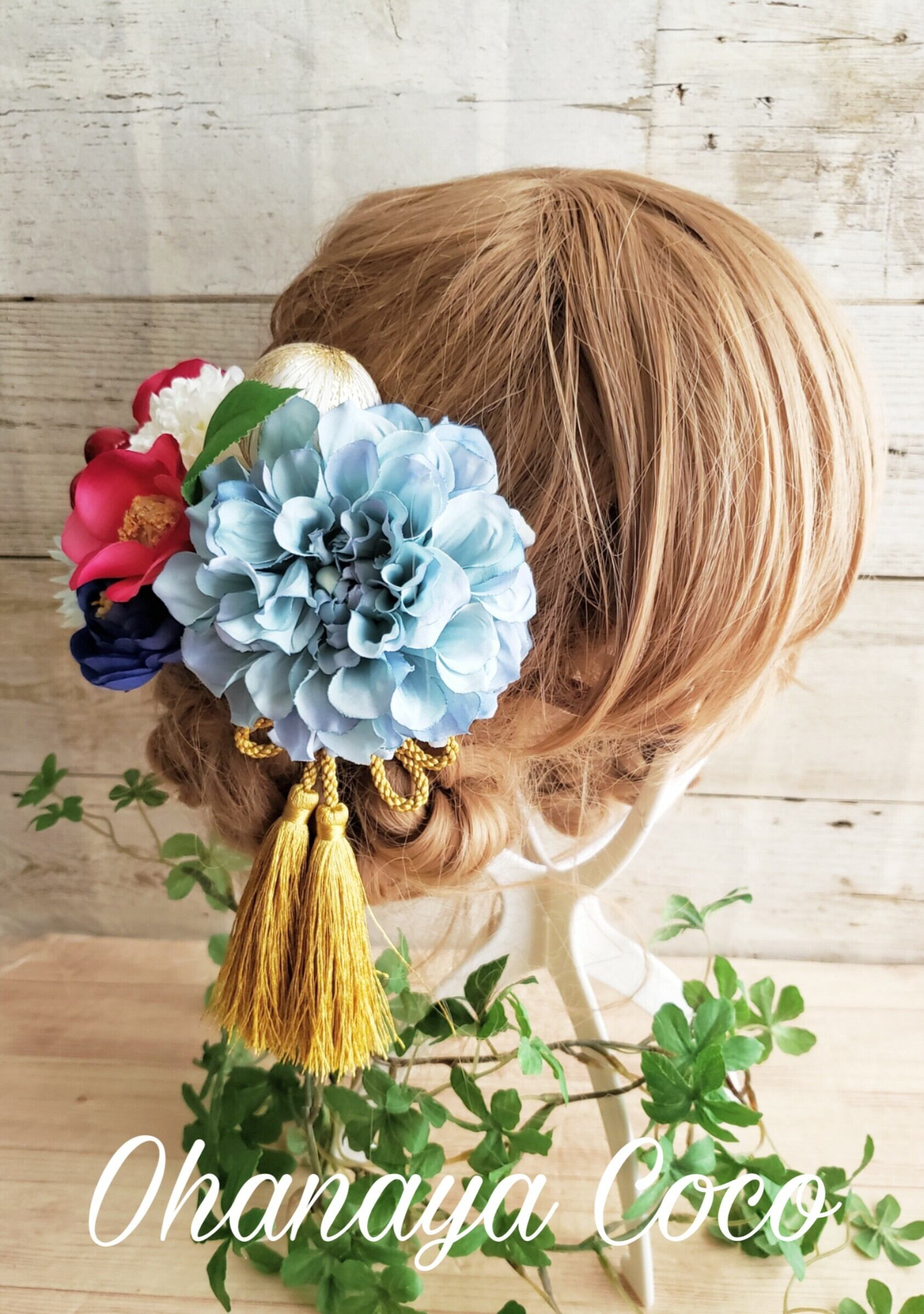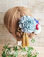 花雫 水色ダリアとピンク椿の髪飾り8点Set