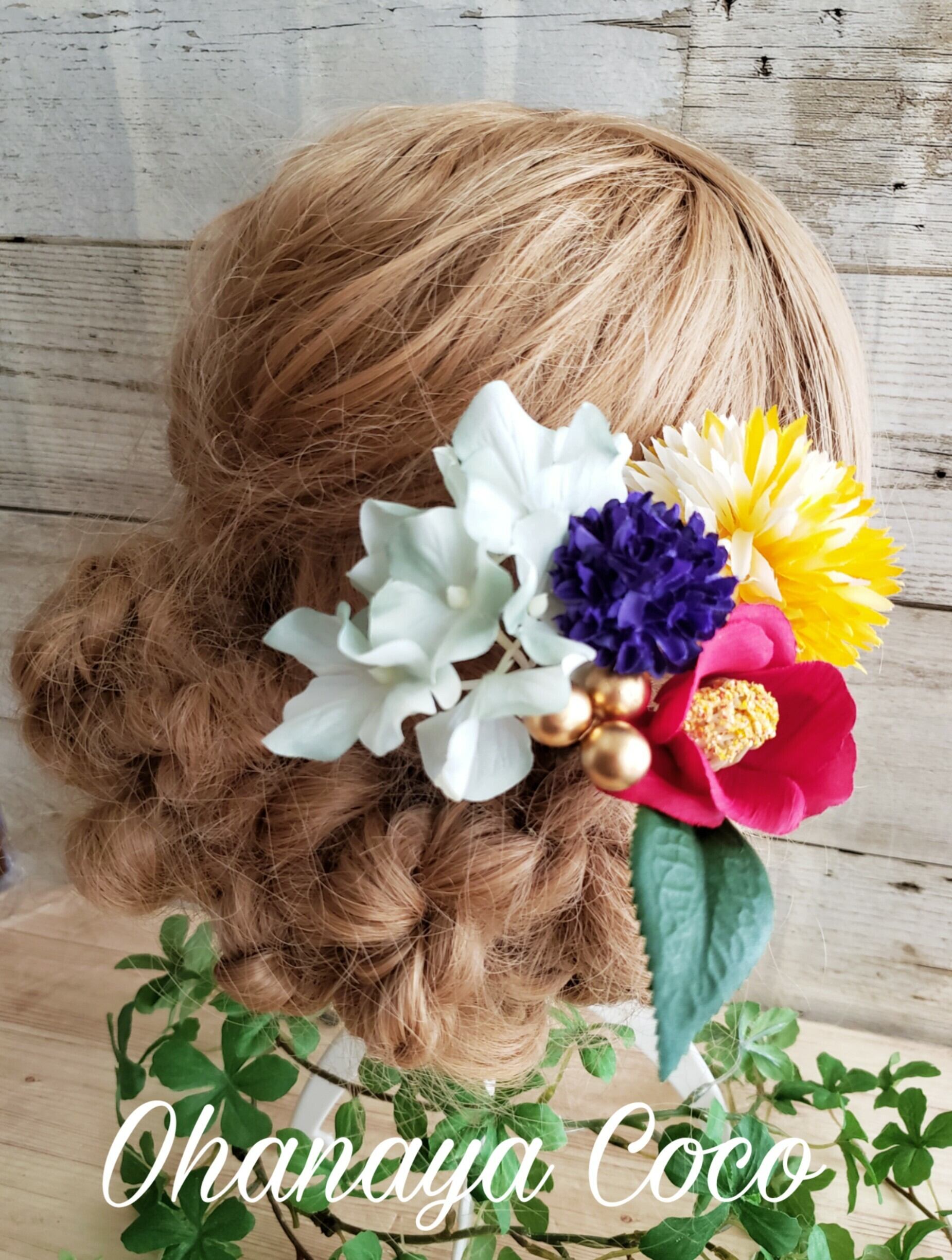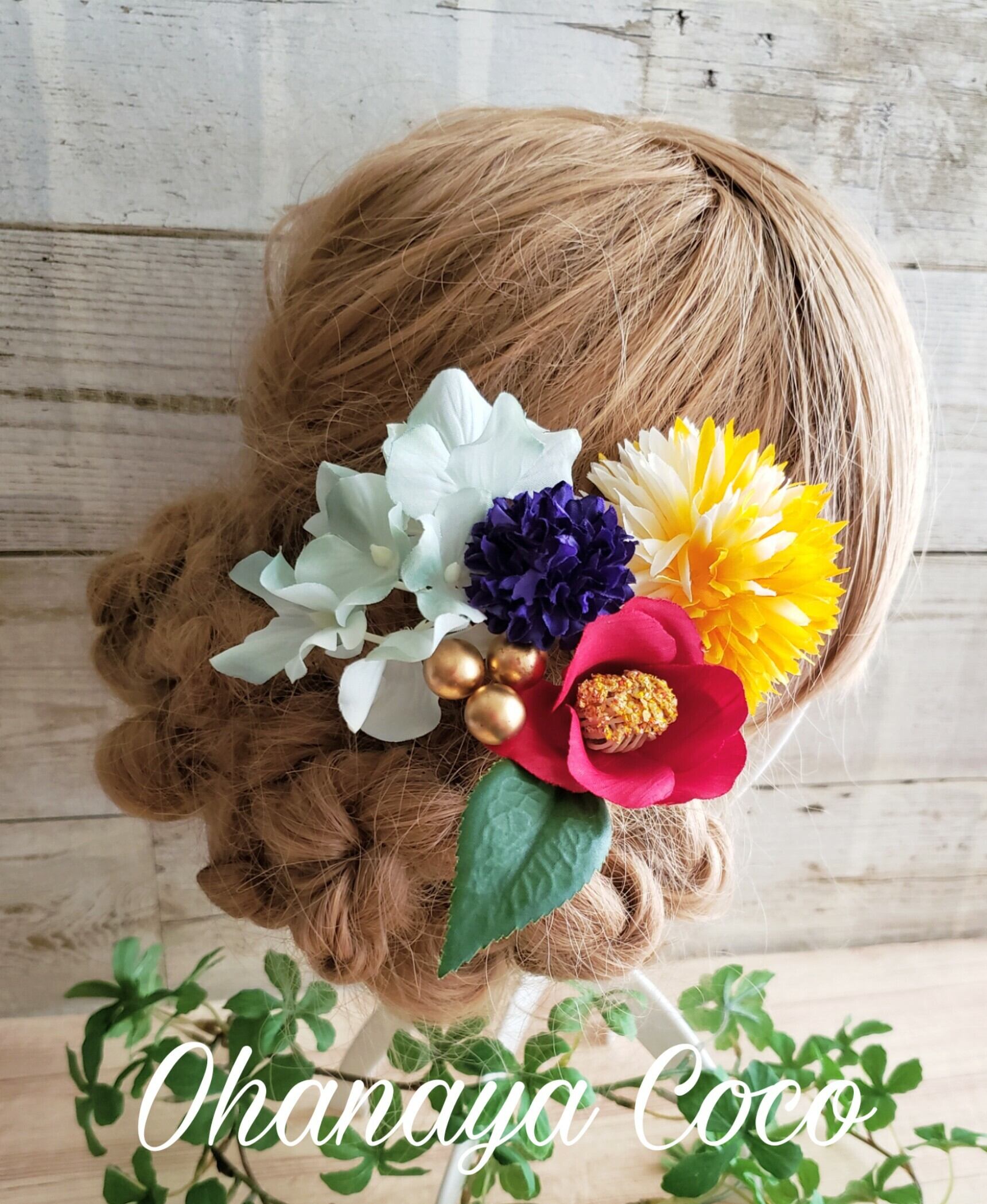 こちらの商品は花姫 ミニ椿とマムの髪飾り5点Setです。
