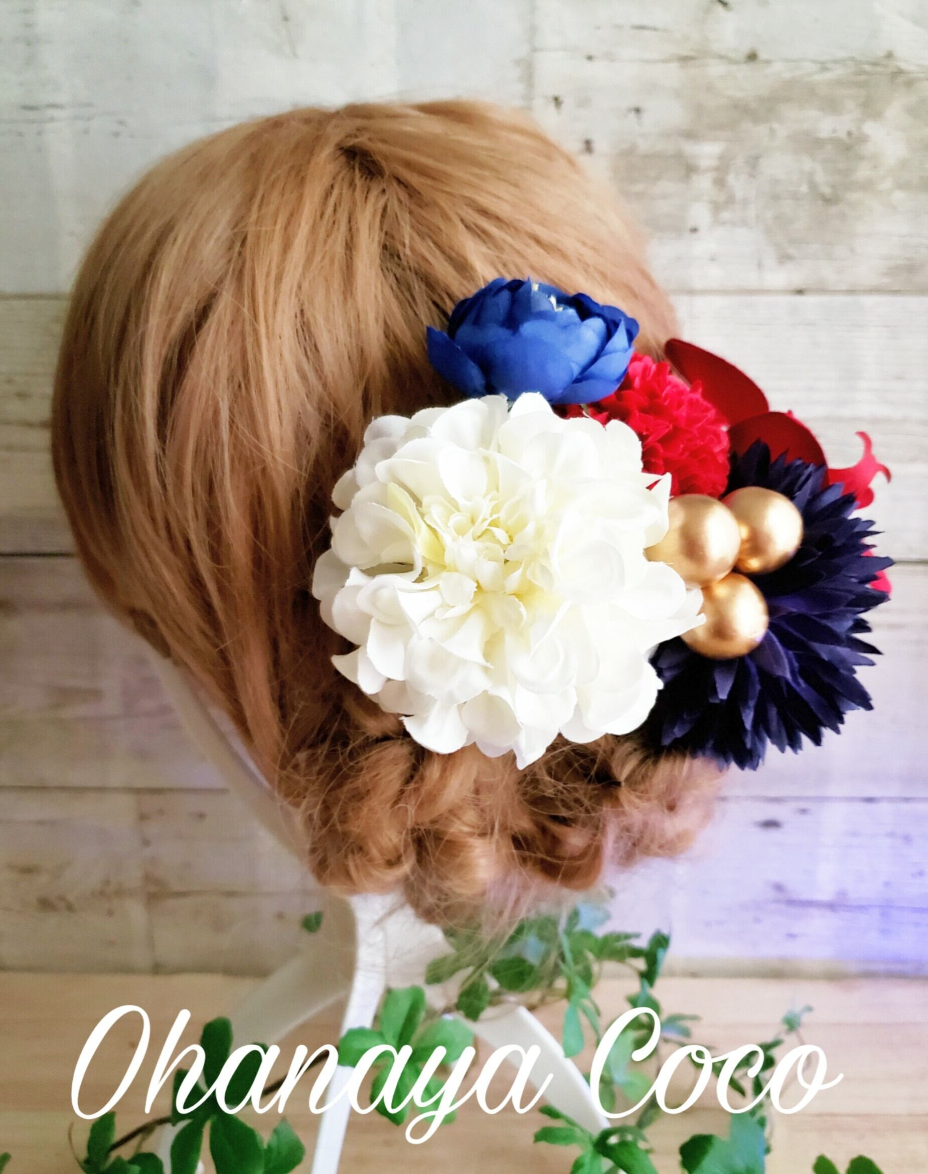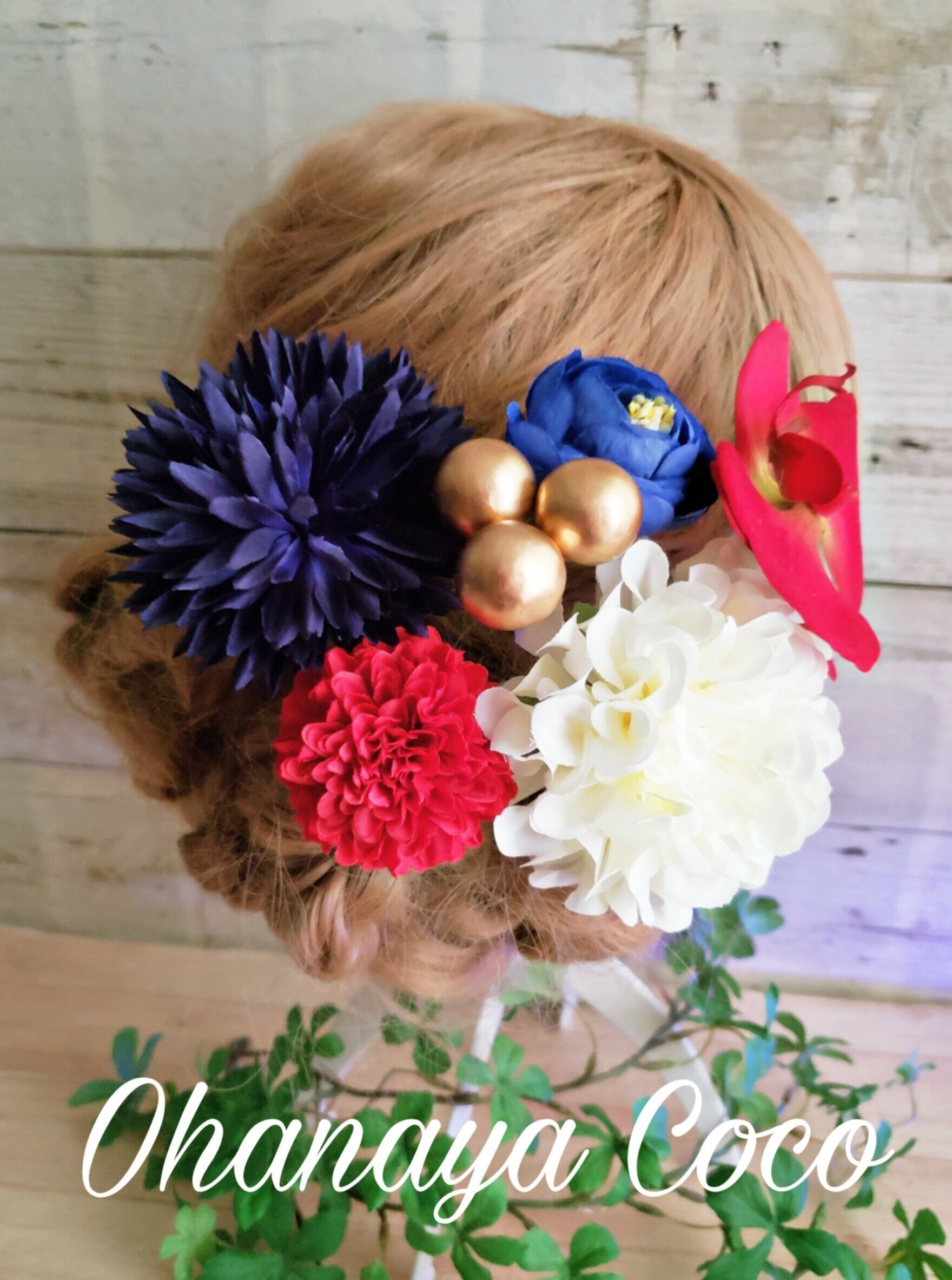 こちらの商品はhirahira 真っ赤な胡蝶蘭と紺色マムの髪飾り6点Setです。