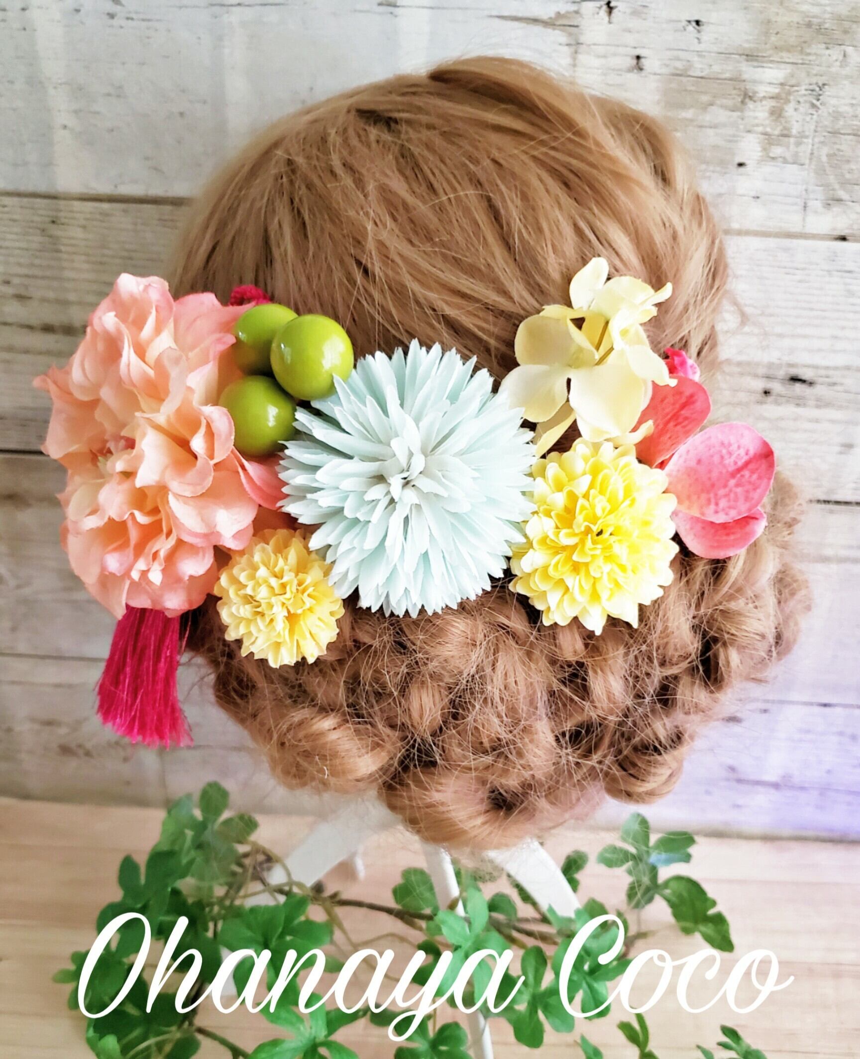 花姫 ピーチダリアとマムの髪飾り8点Set No545 成人式 浴衣