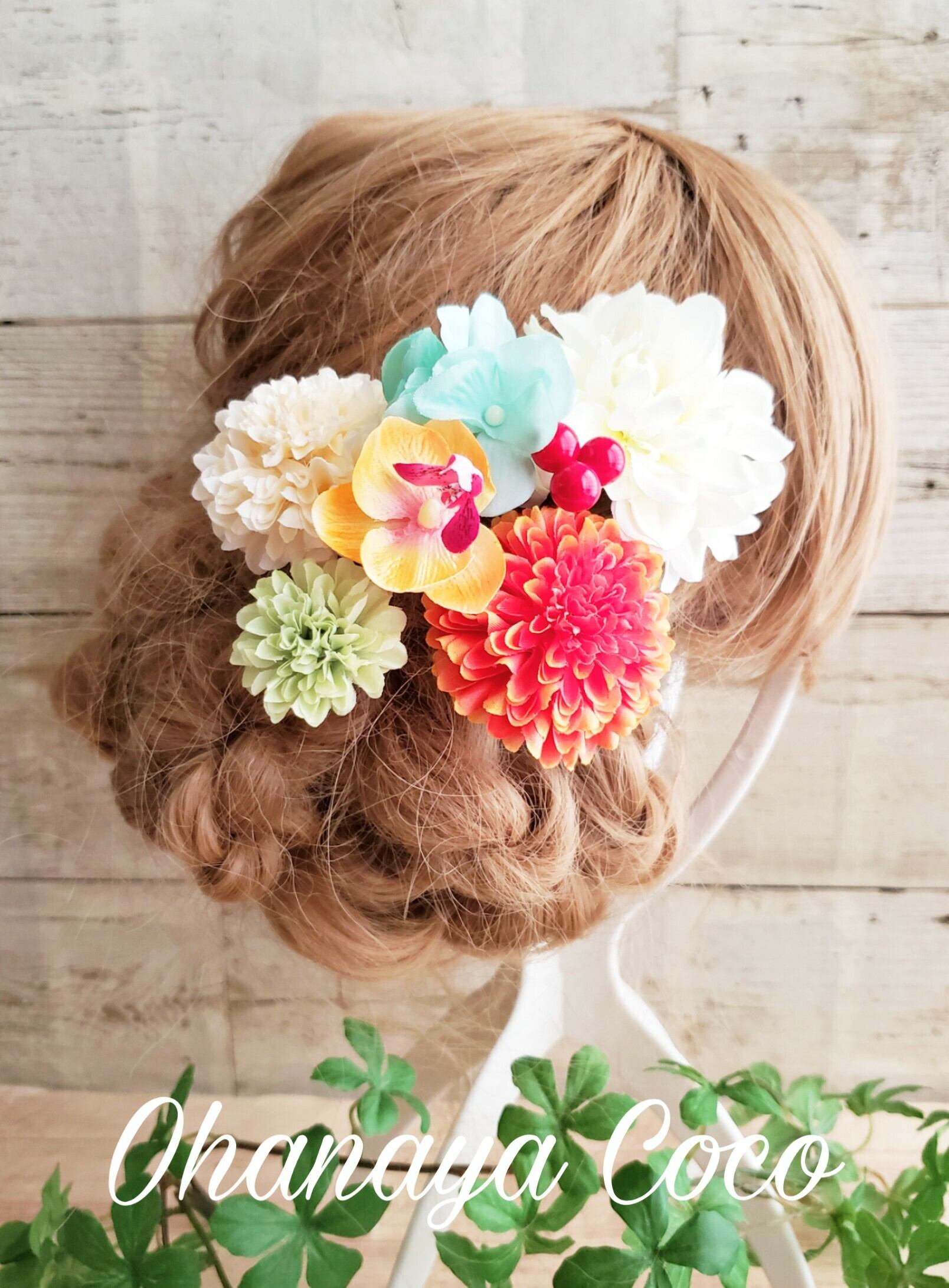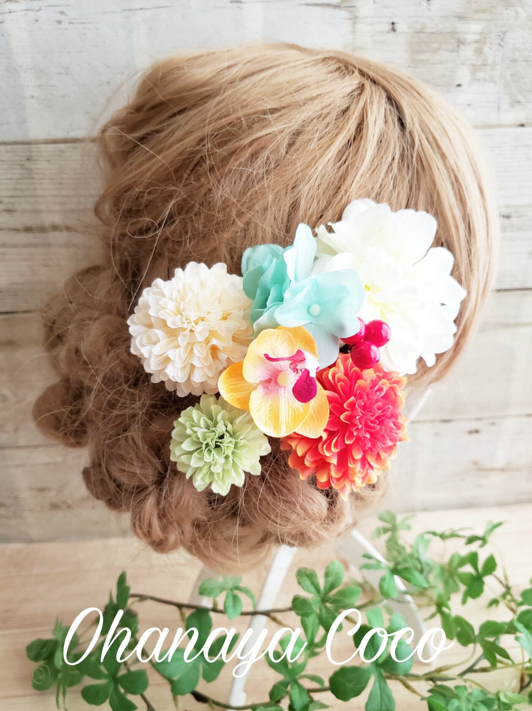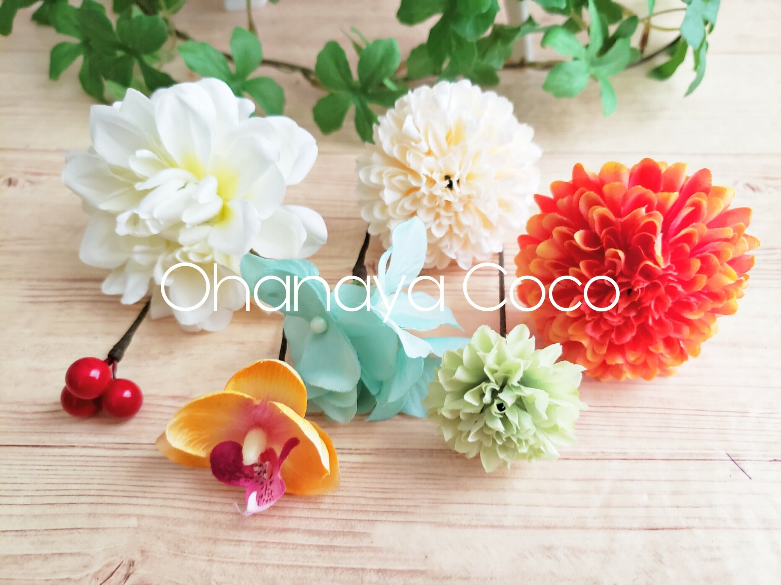 こちらの商品は爽花 オレンジマムとダリアの髪飾り7点Setです。
