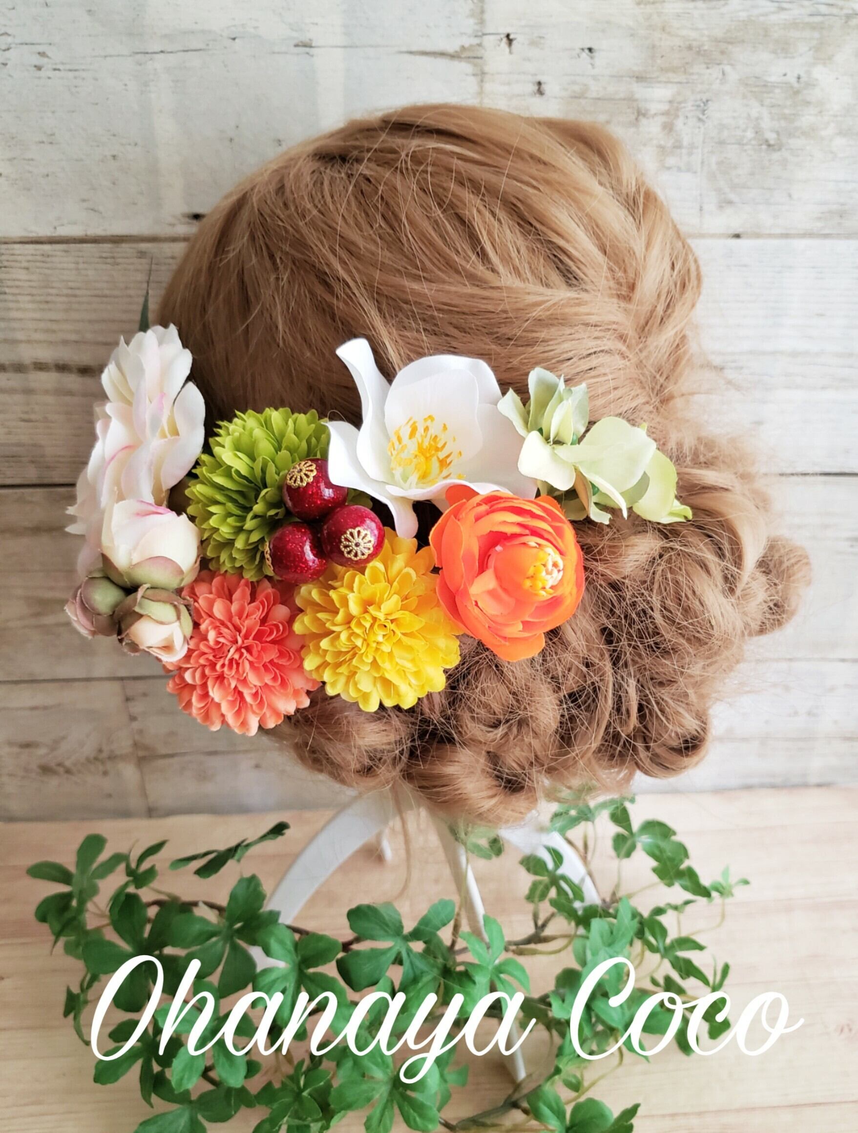こちらの商品は新緑ビタミンカラー 椿とマムの髪飾り9点Setです。