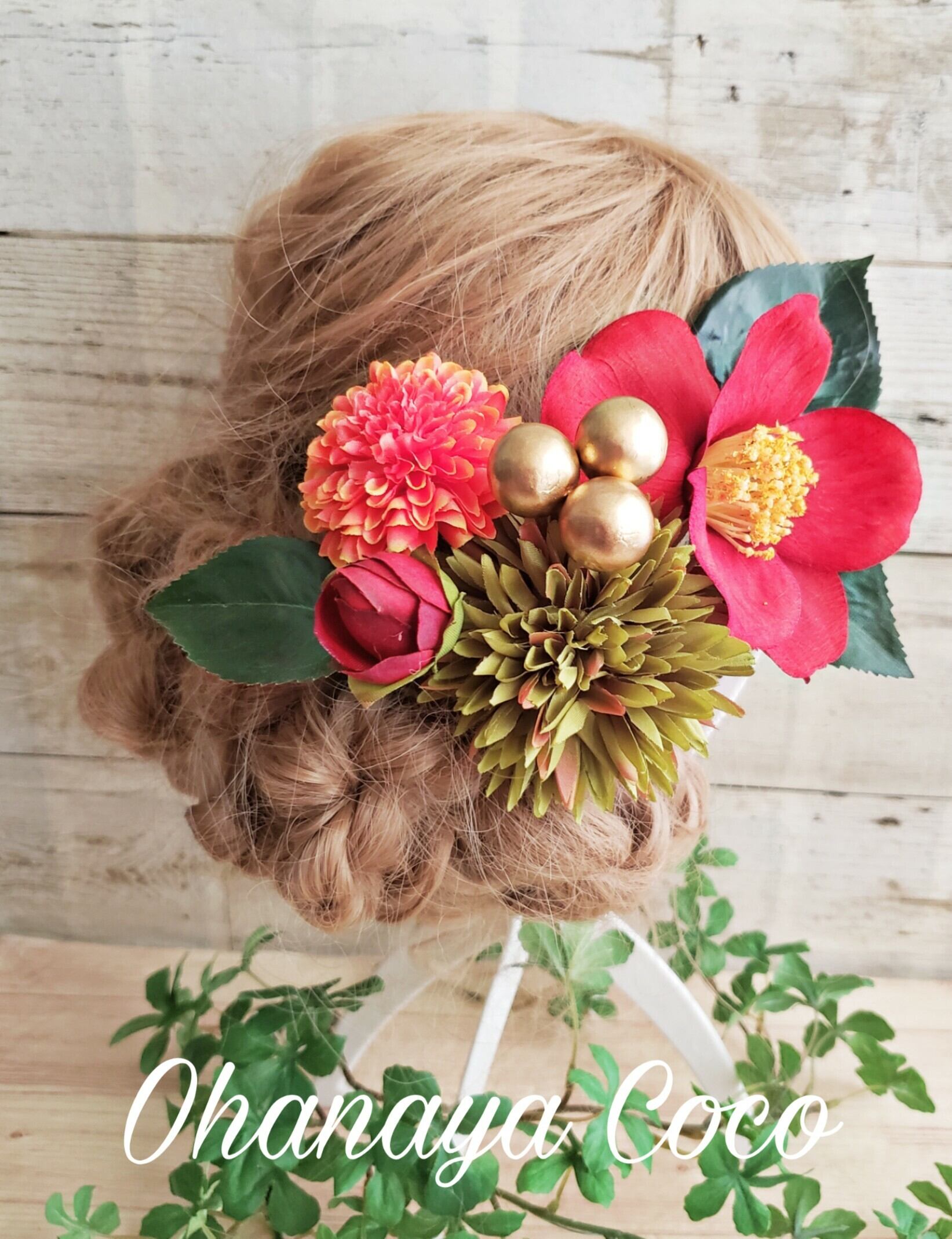 こちらの商品は花雅 真っ赤な江戸椿とマムの和モダン髪飾り5点Setです。