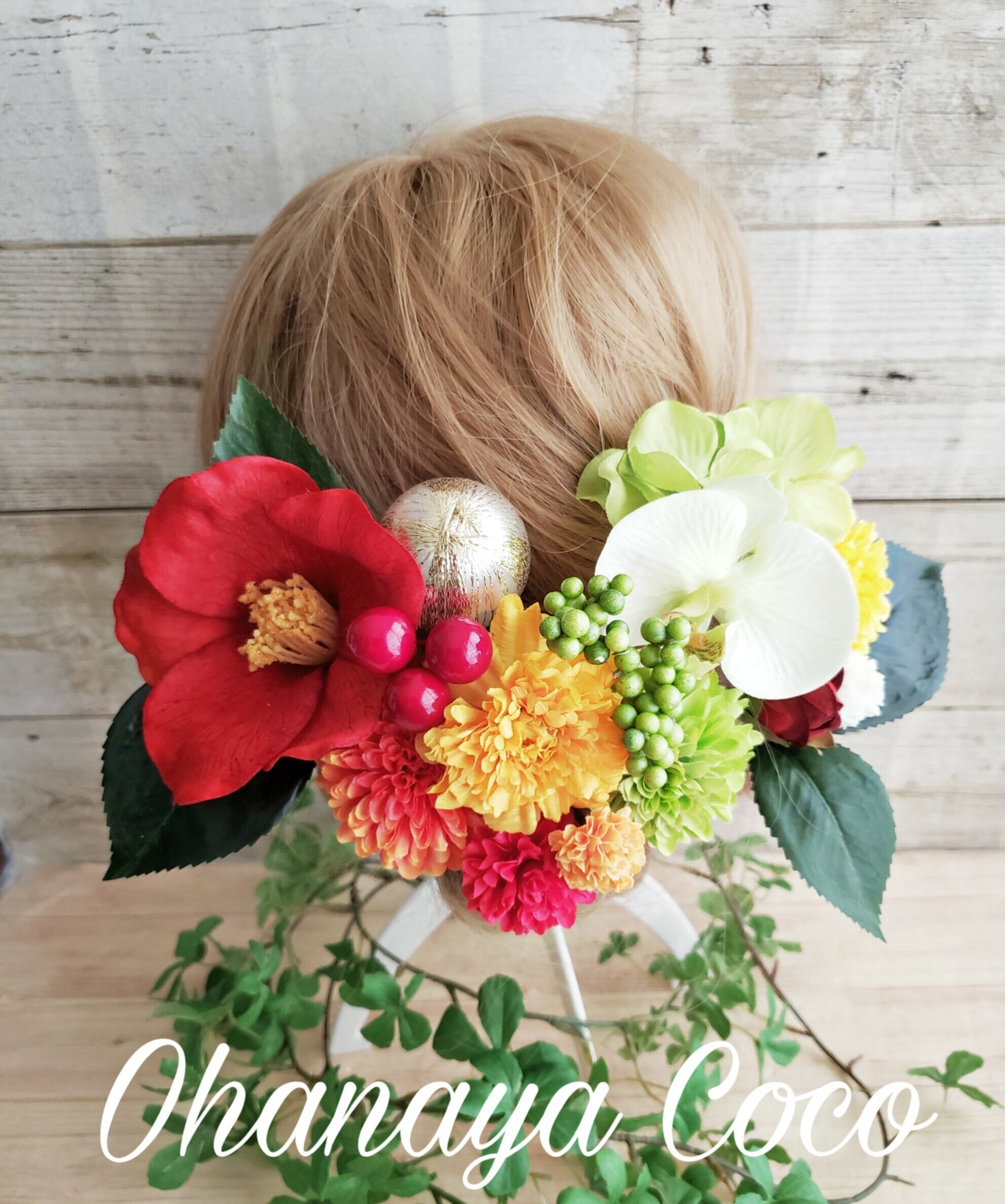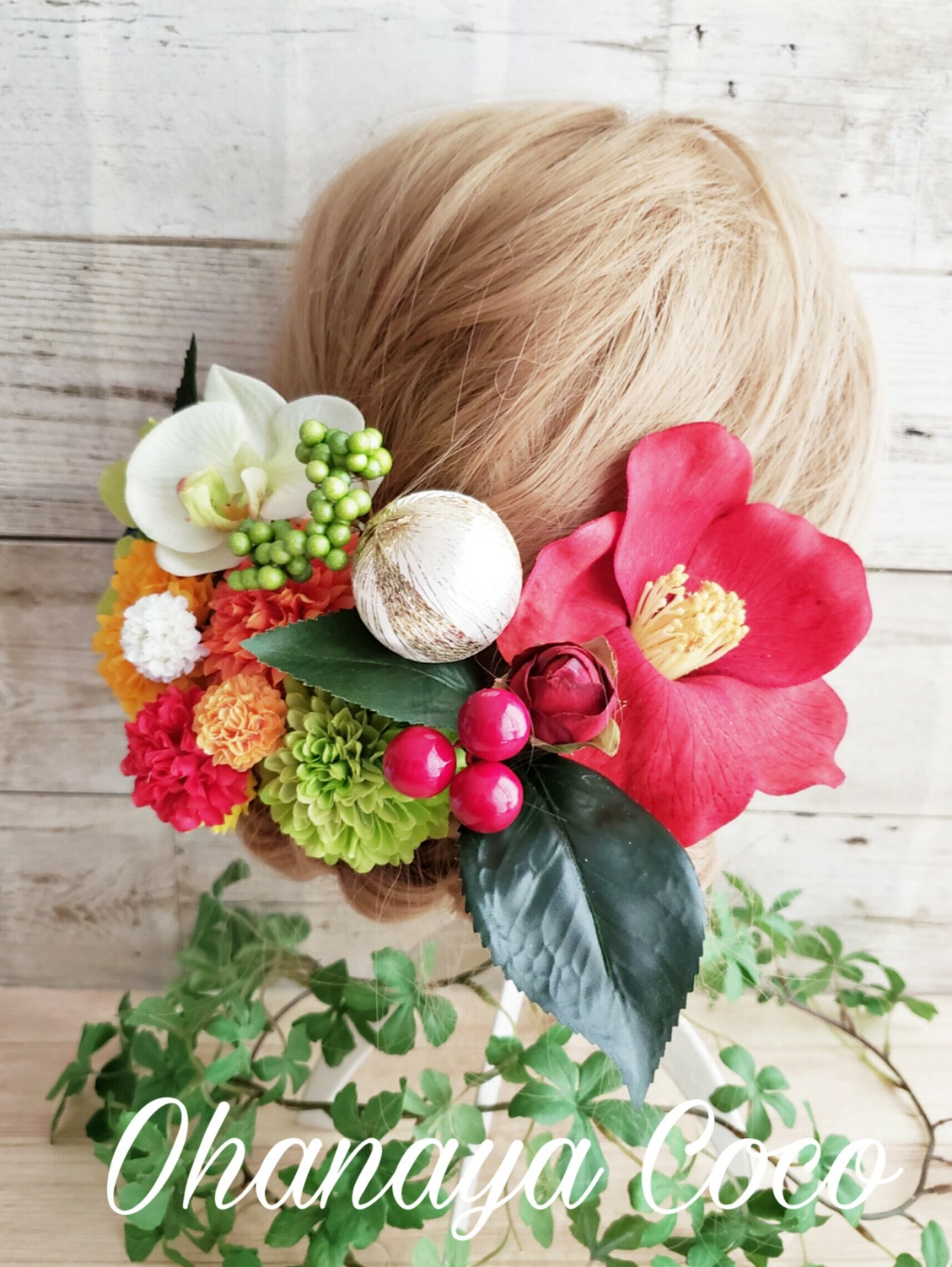 花雅 江戸椿と金糸ボールの髪飾り15点Setです。