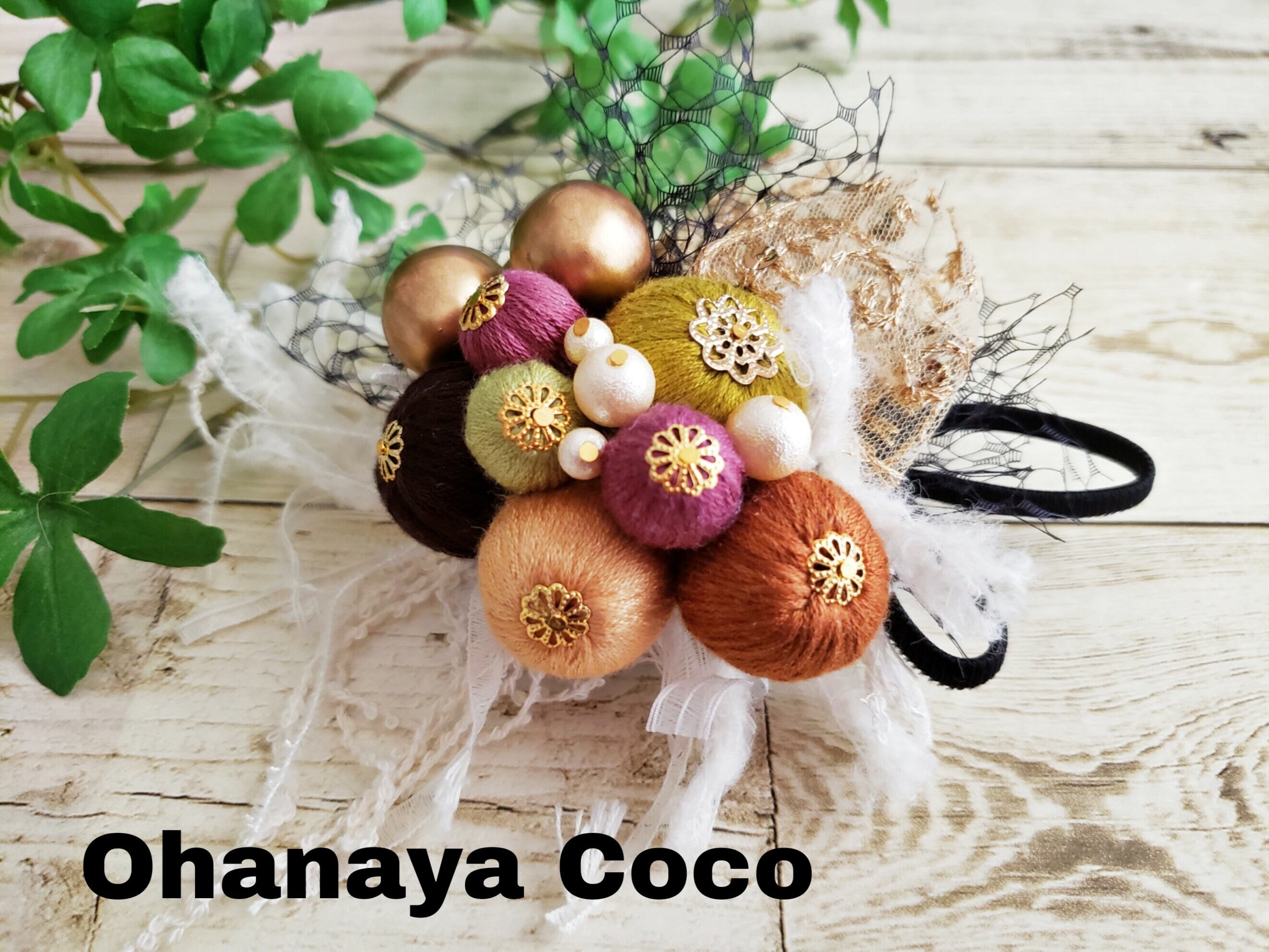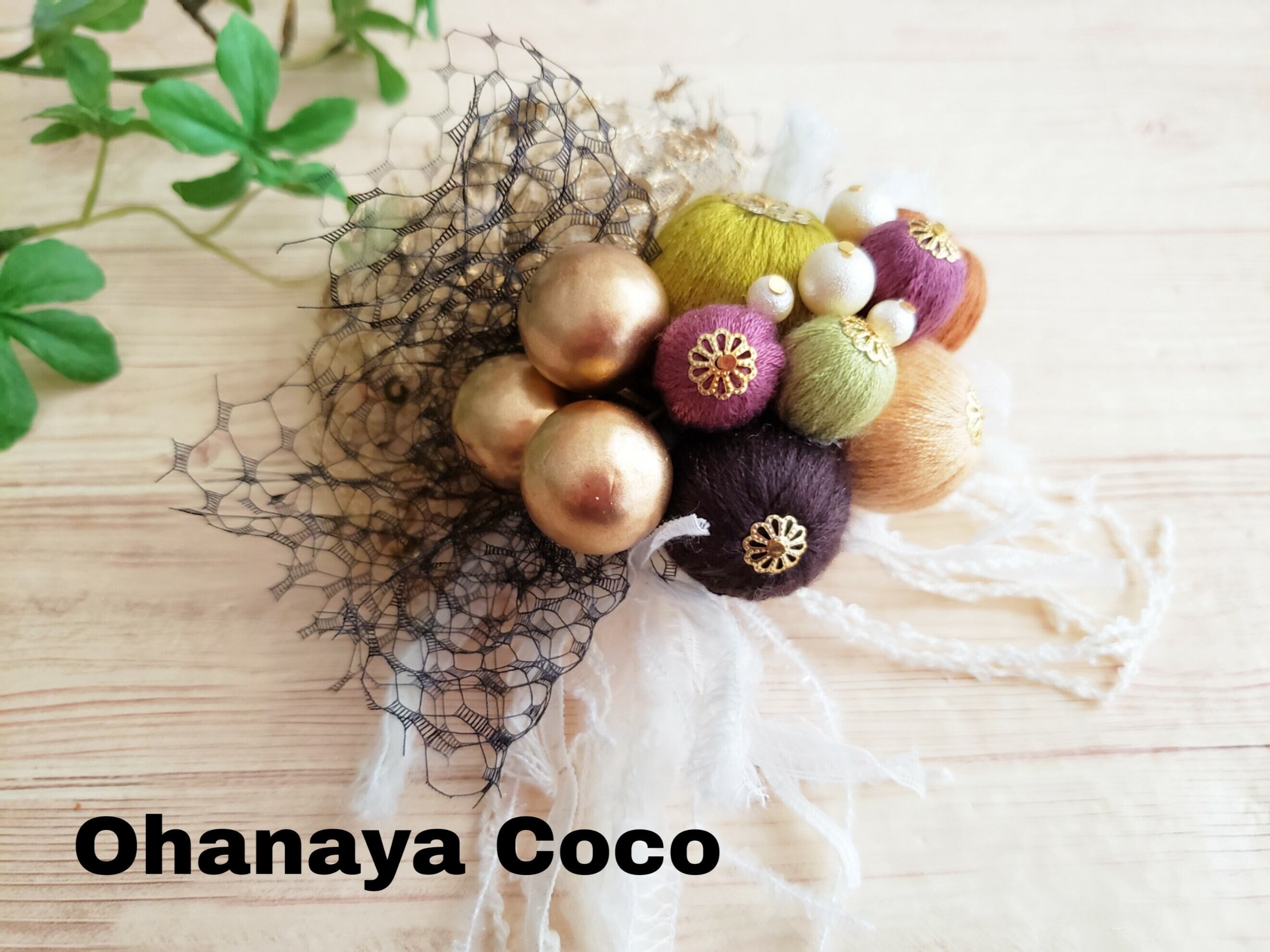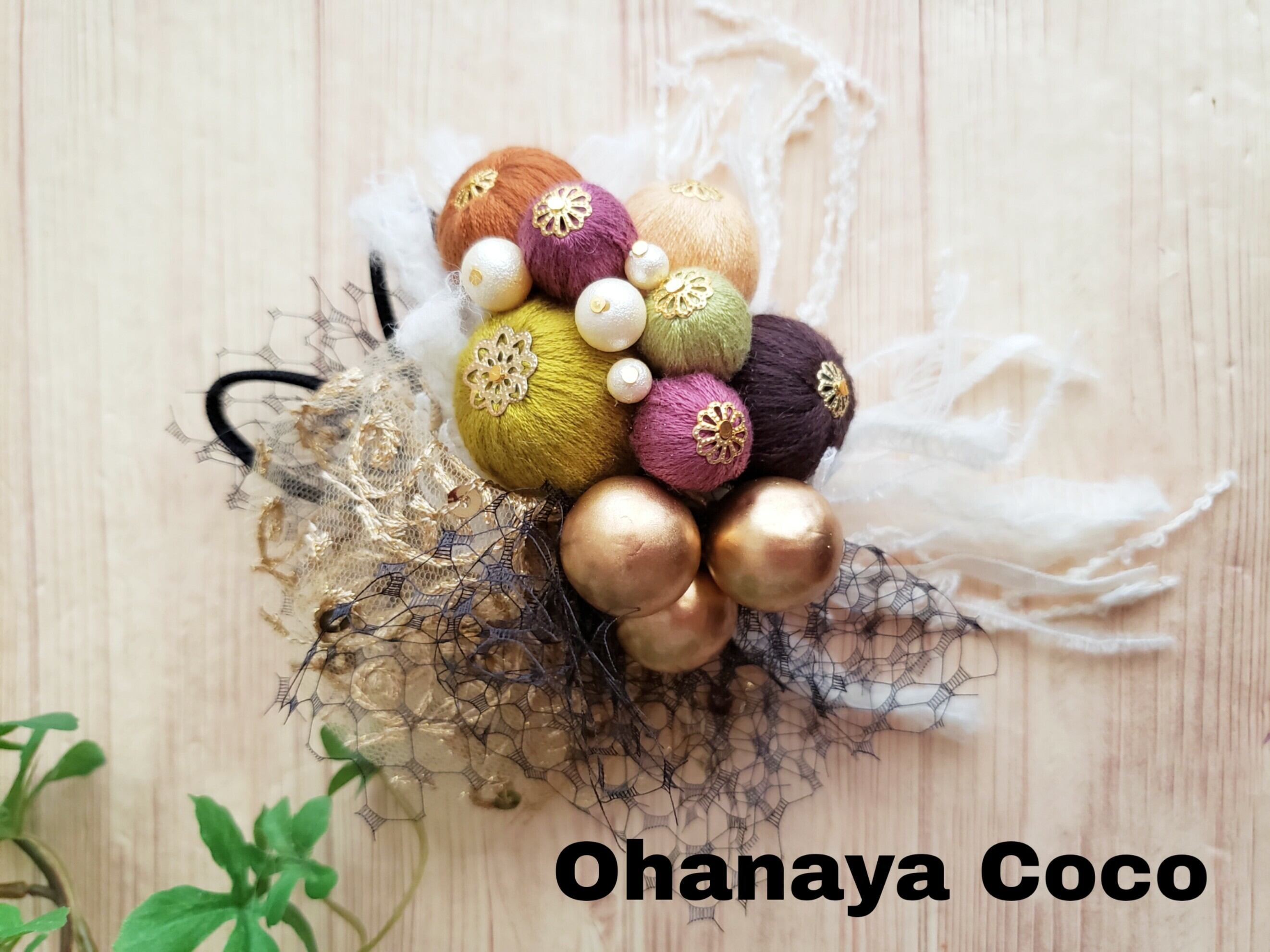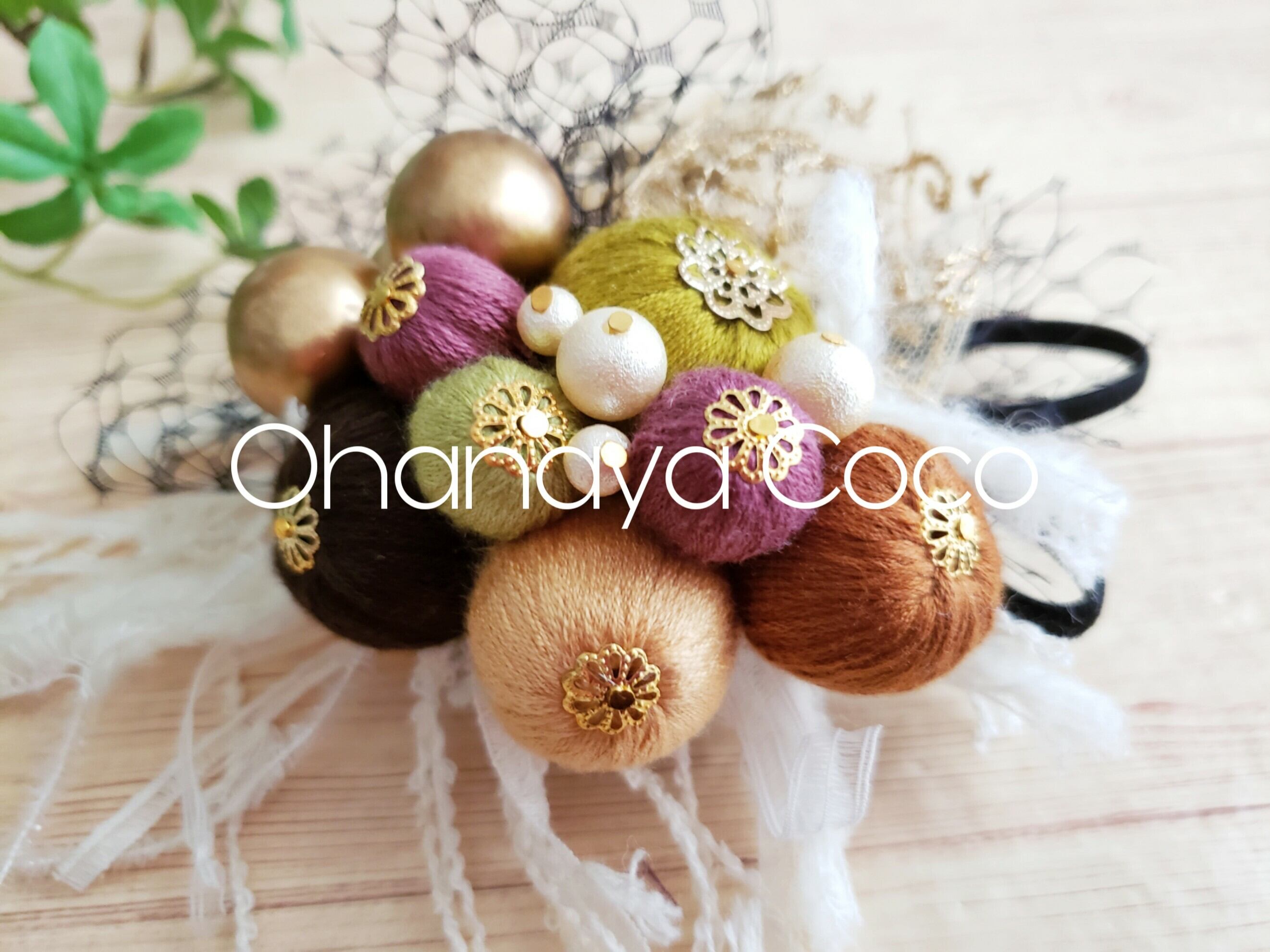 落ち着いた色合いの絹糸ボールとチュールをアンティーク風に可愛いく仕上げました。