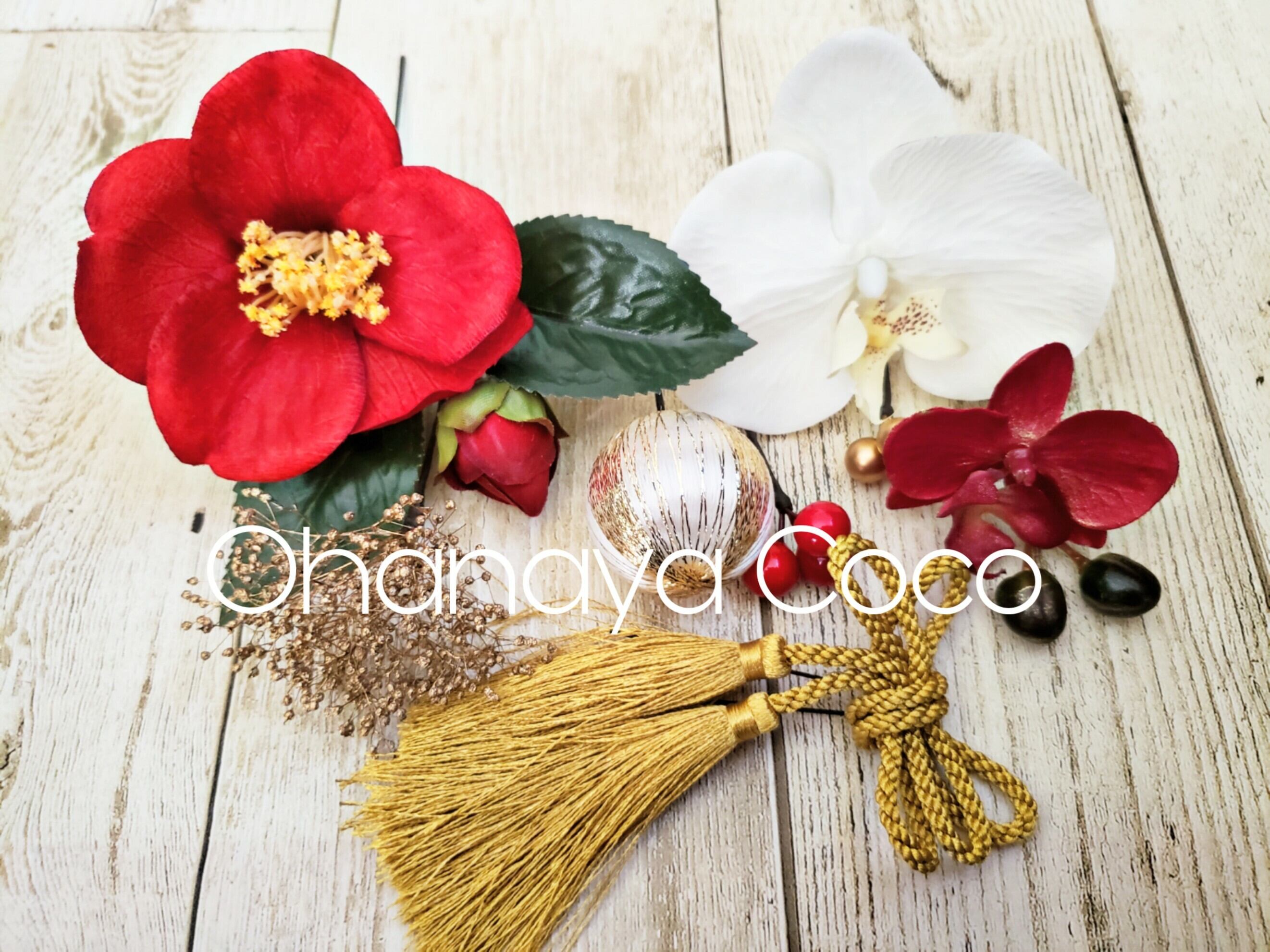 花雅 江戸椿とダリアの水引髪飾り8点Setです。