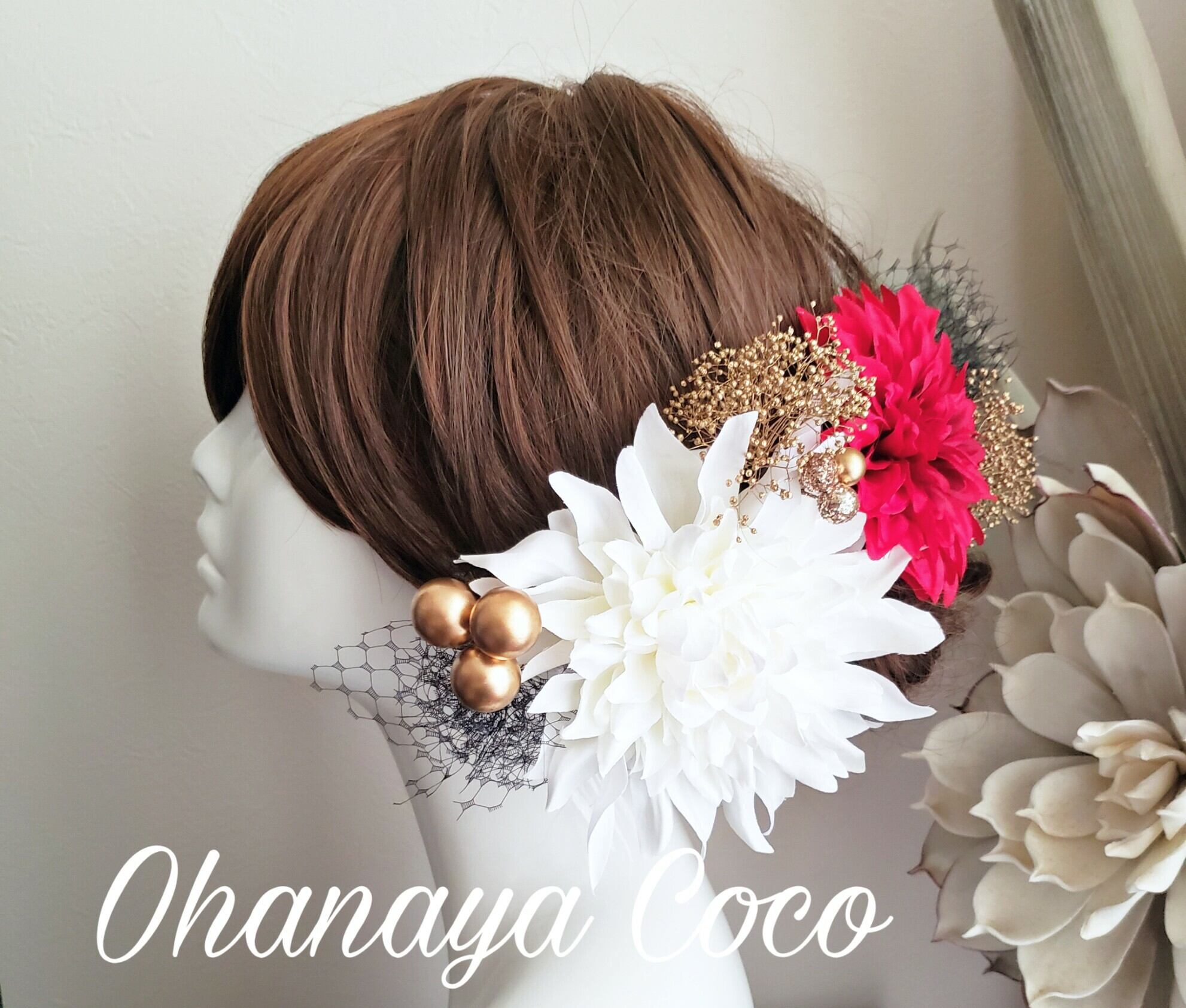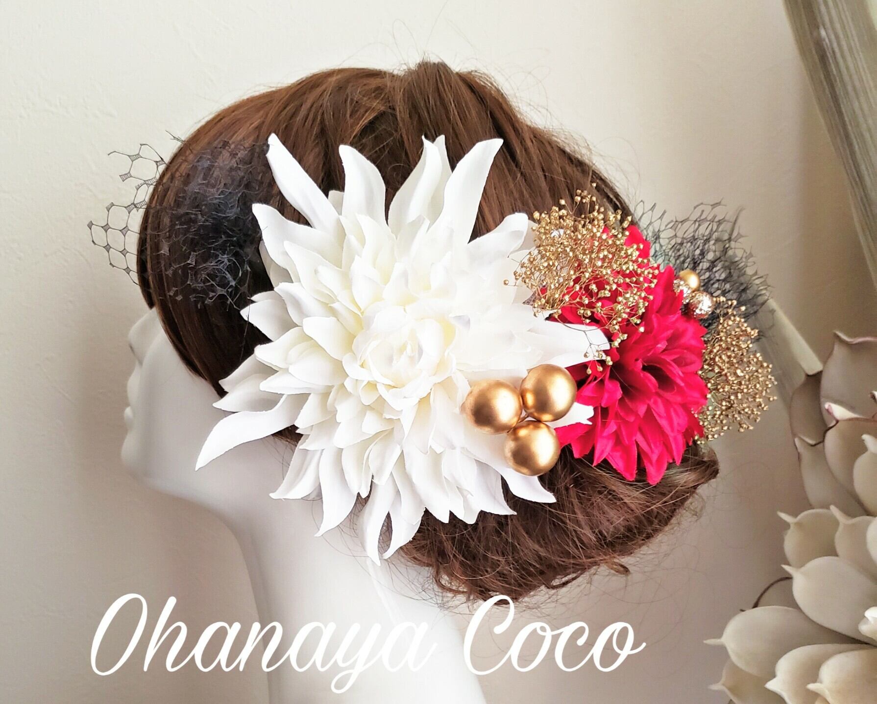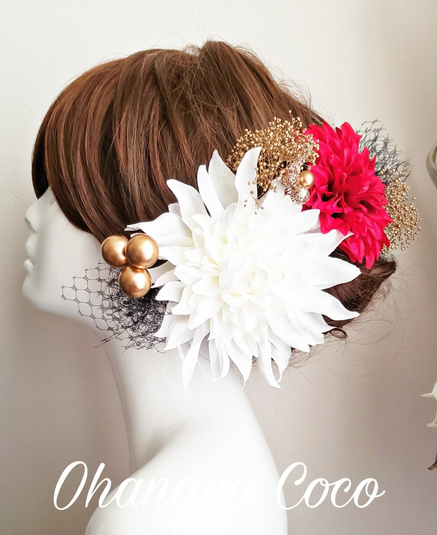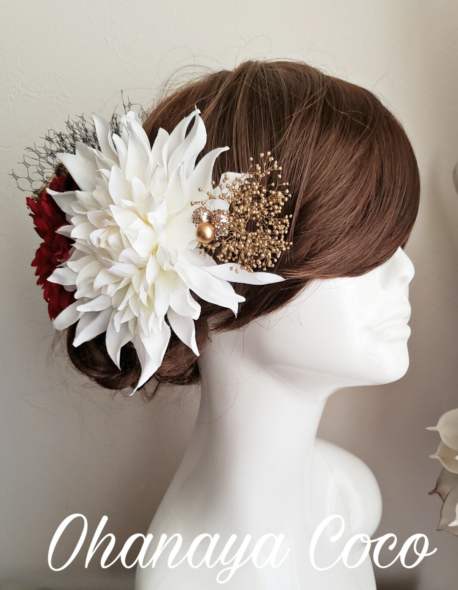 華やか 真っ白ダリアと真っ赤なダリアの髪飾り8点Setです。