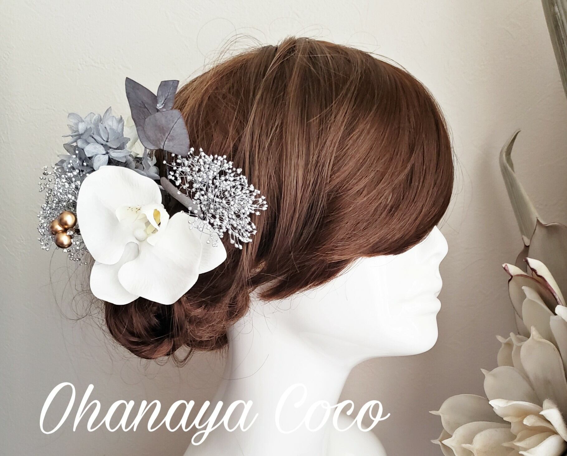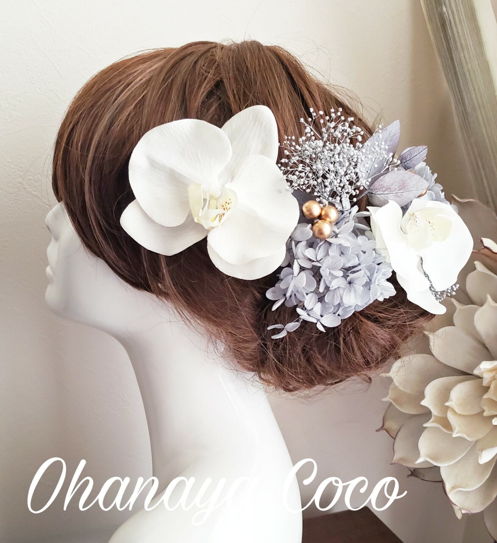 本物のお花のプリザーブドフラワーの紫陽花とかすみ草、アーティフィシャルフラワー(造花)の胡蝶蘭を使用した高級感のある大人な雰囲気が素敵な髪飾りです。