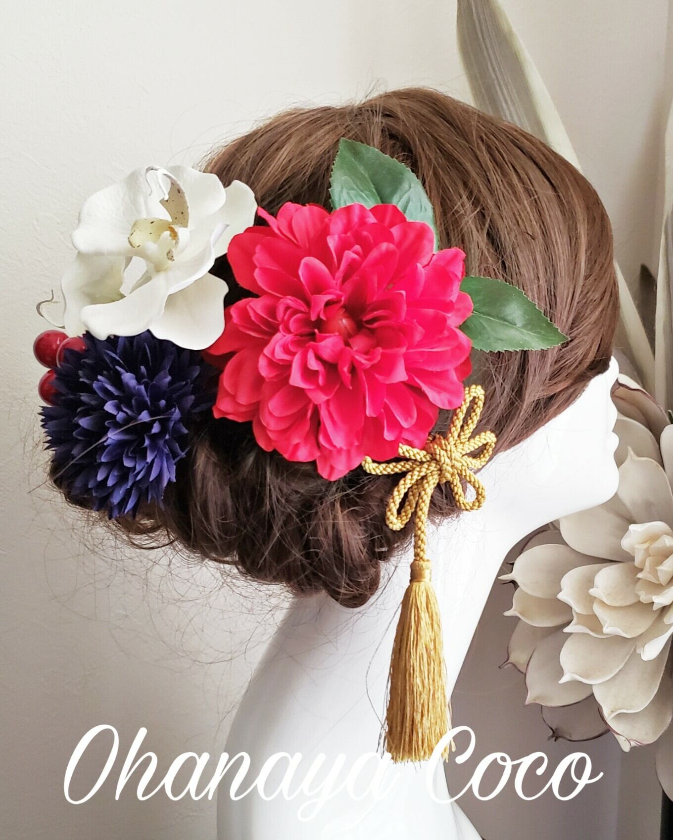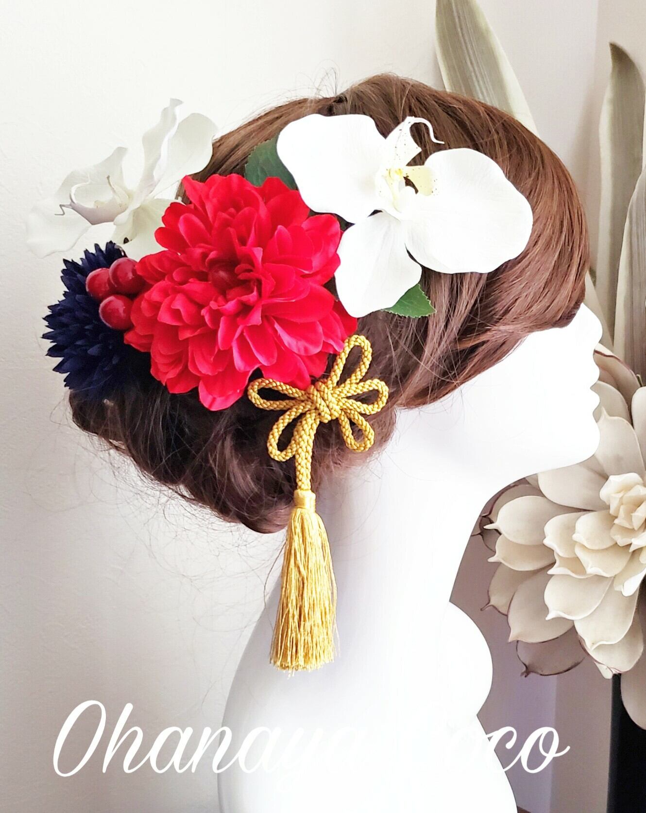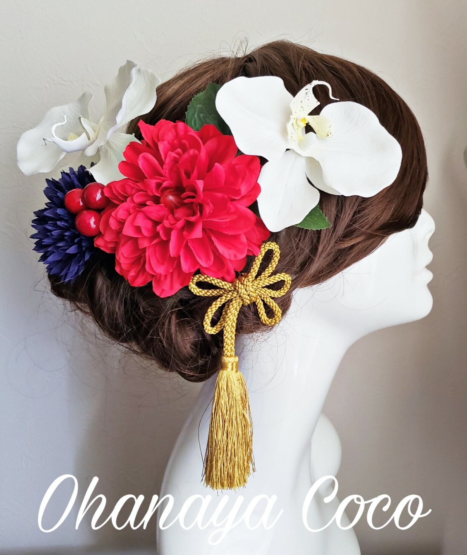 こちらの商品はhirahira蝶舞う 胡蝶蘭と真っ赤なダリアの髪飾り7点Setです。
