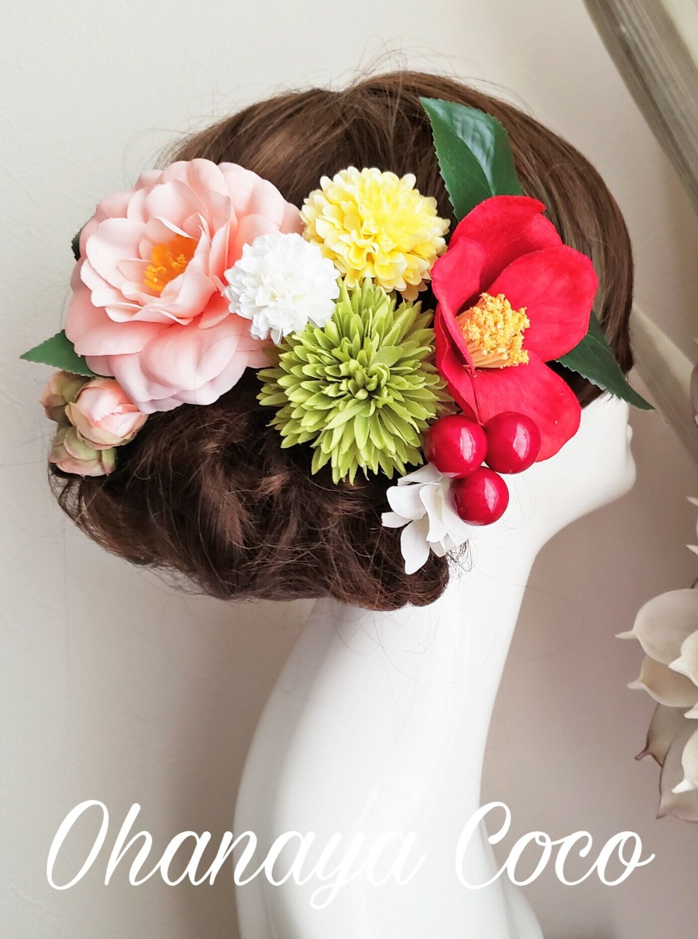 2種類椿とポンポンマムの髪飾り10点Setです。