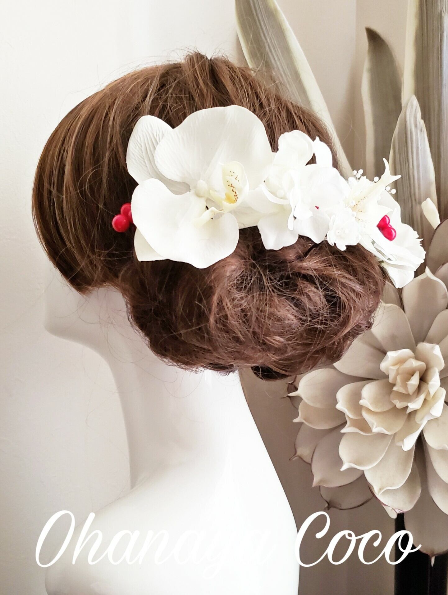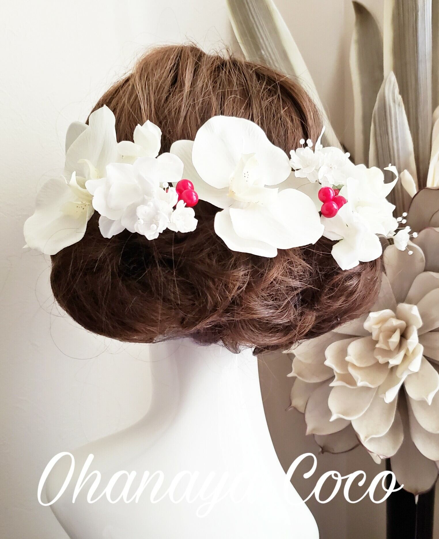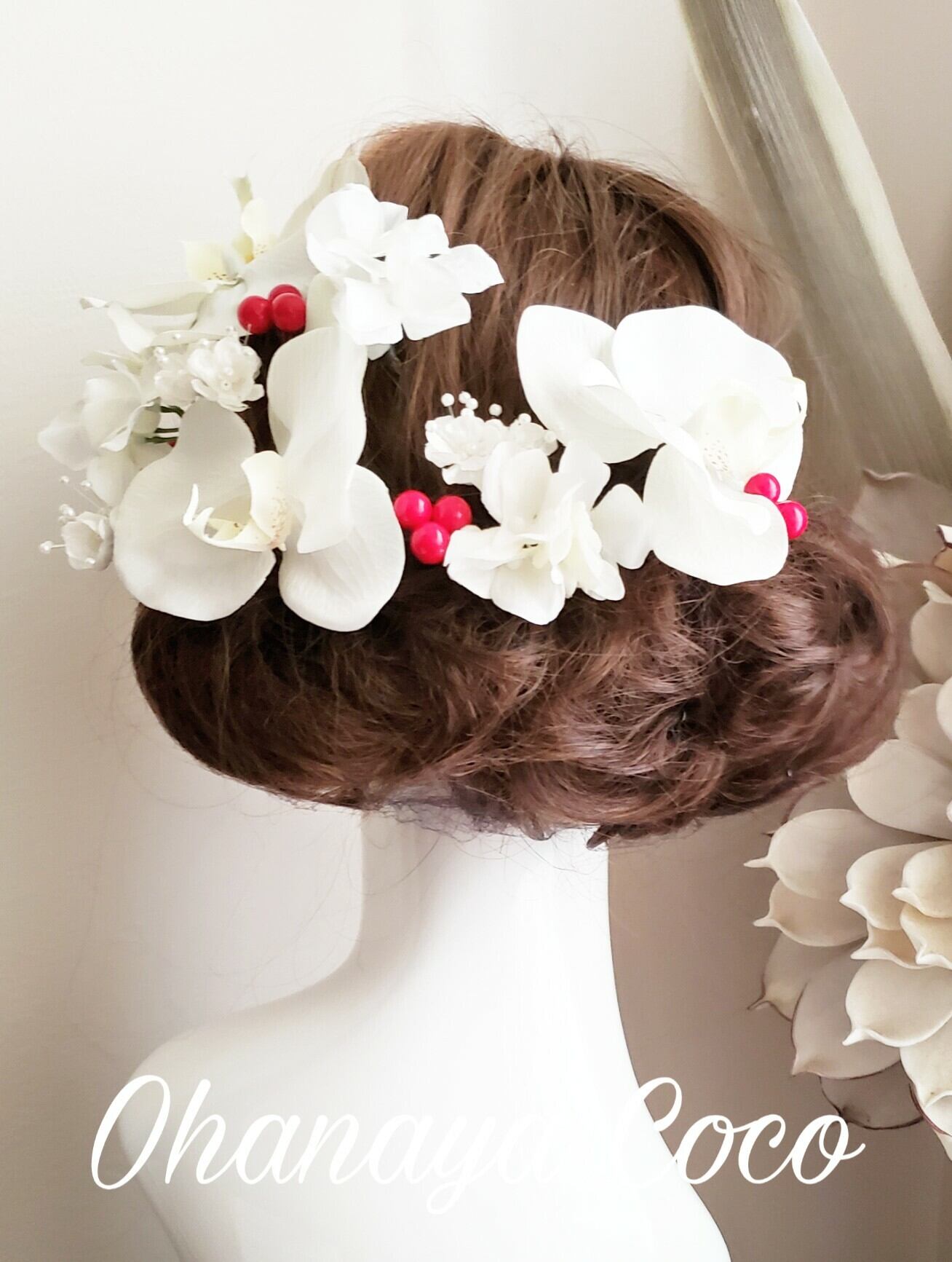 hirahira 蝶舞う胡蝶蘭とホワイト小花の髪飾り13点Set です。