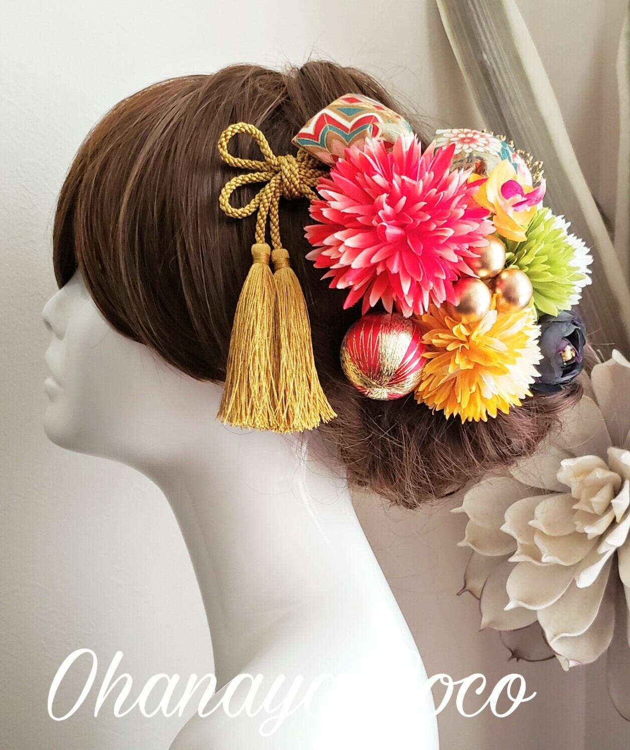 花姫 ponponマムと銀杏形リボンの髪飾り13点Setです。