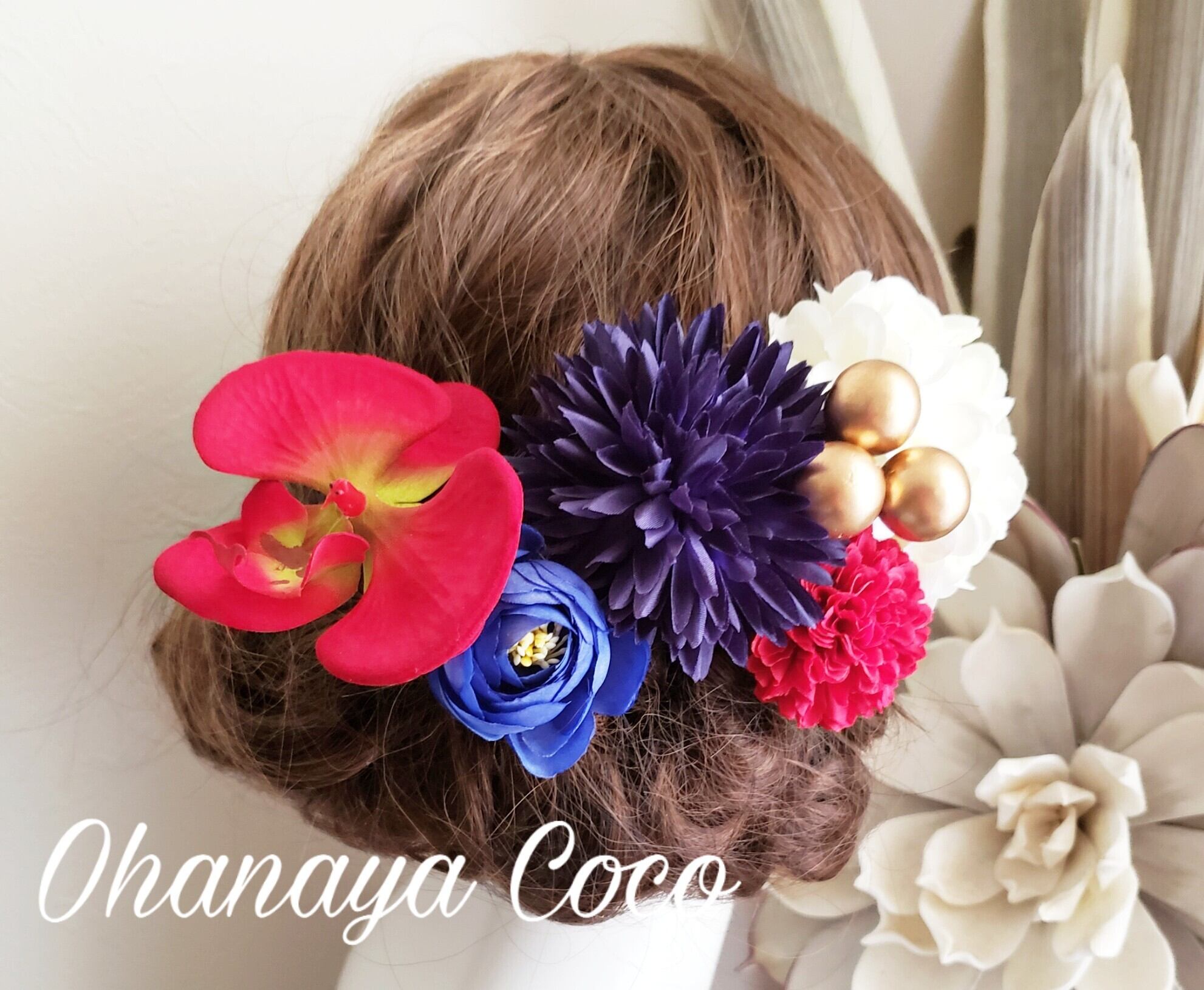 こちらの商品はhirahira 真っ赤な胡蝶蘭と紺色マムの髪飾り6点Setです。