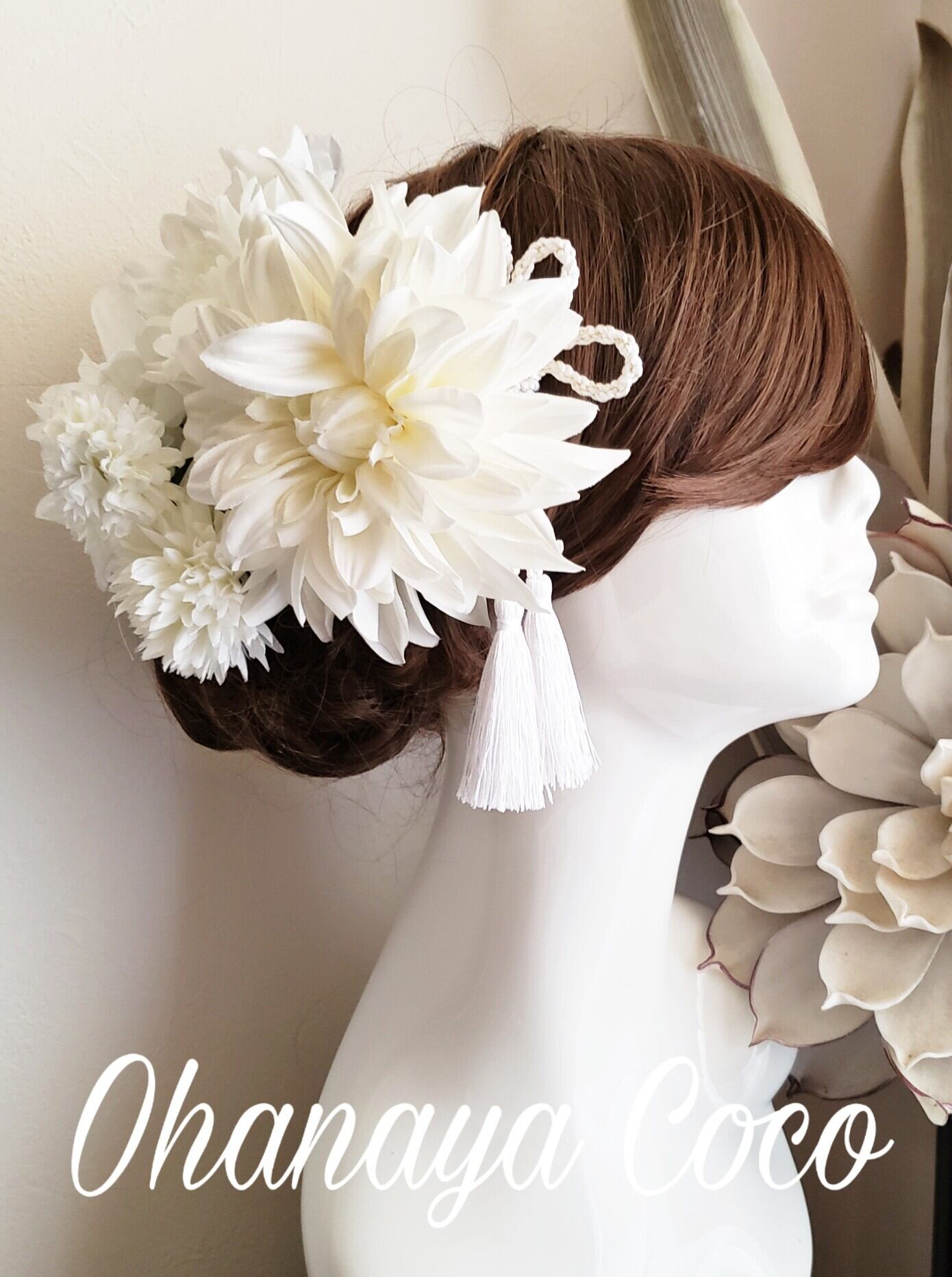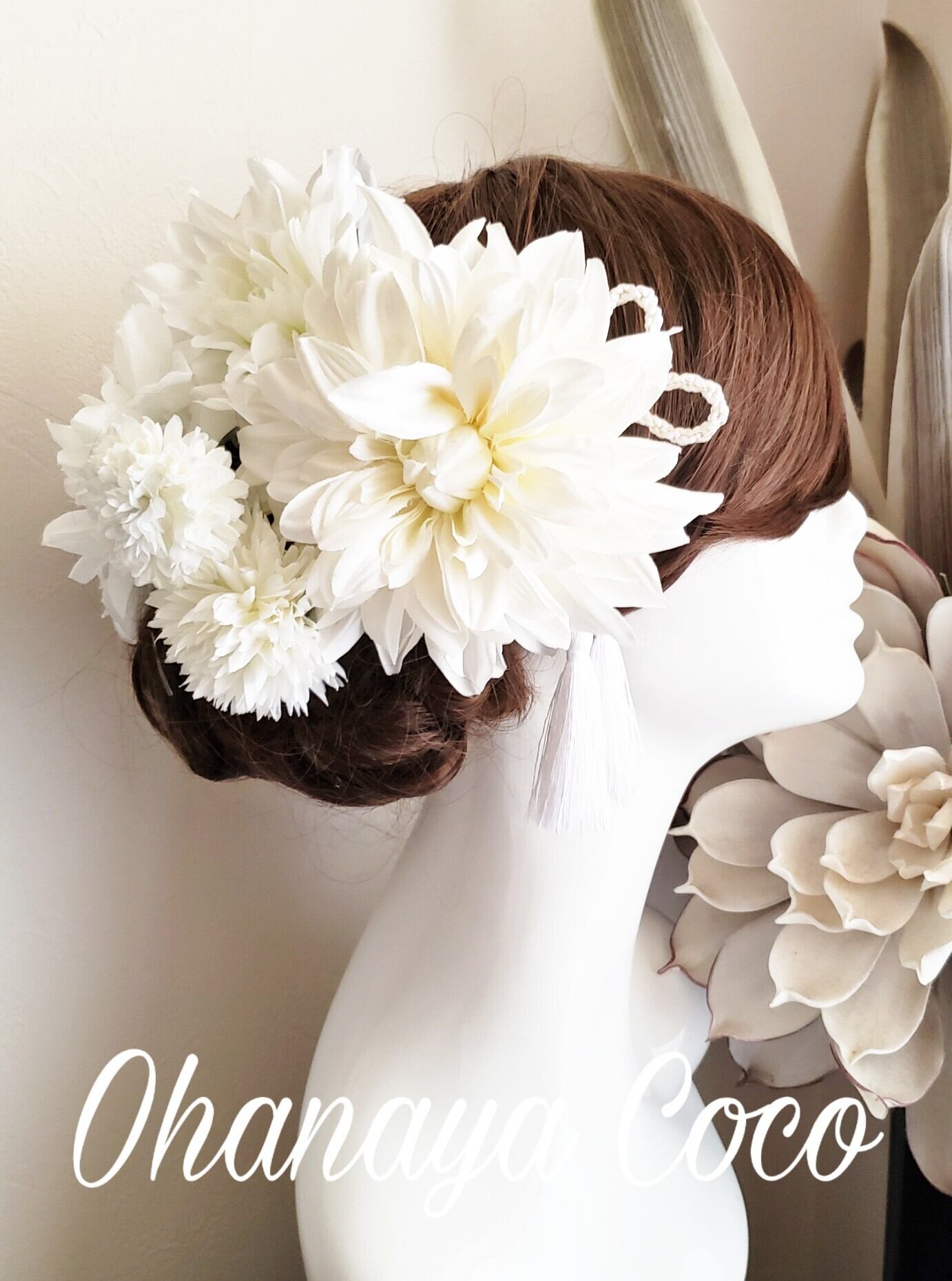 こちらの商品はwhiteダリアとマムの髪飾り9点Setです。