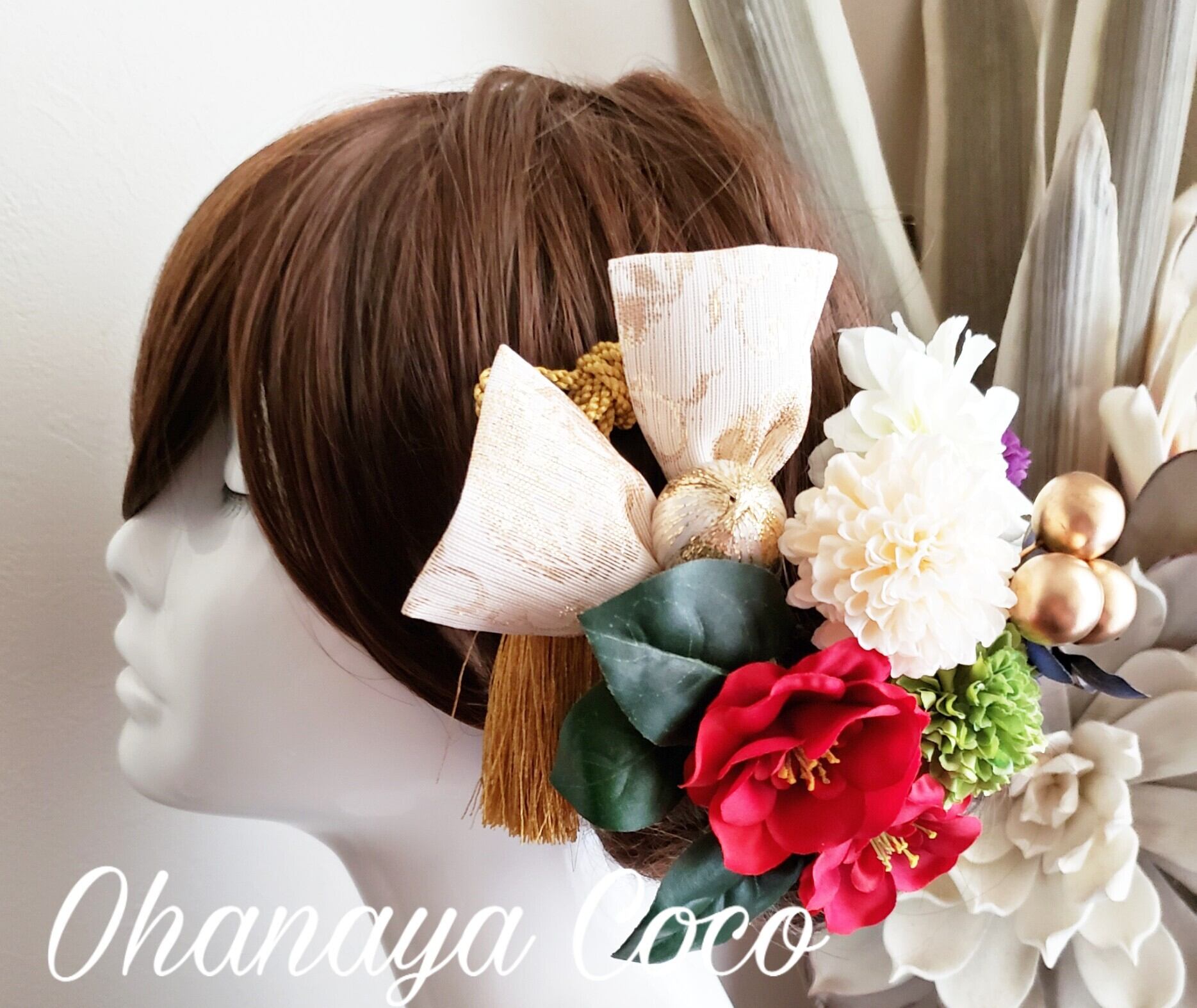華雅 椿と銀杏リボンの髪飾り14点Set No652 成人式 結婚式 髪飾り