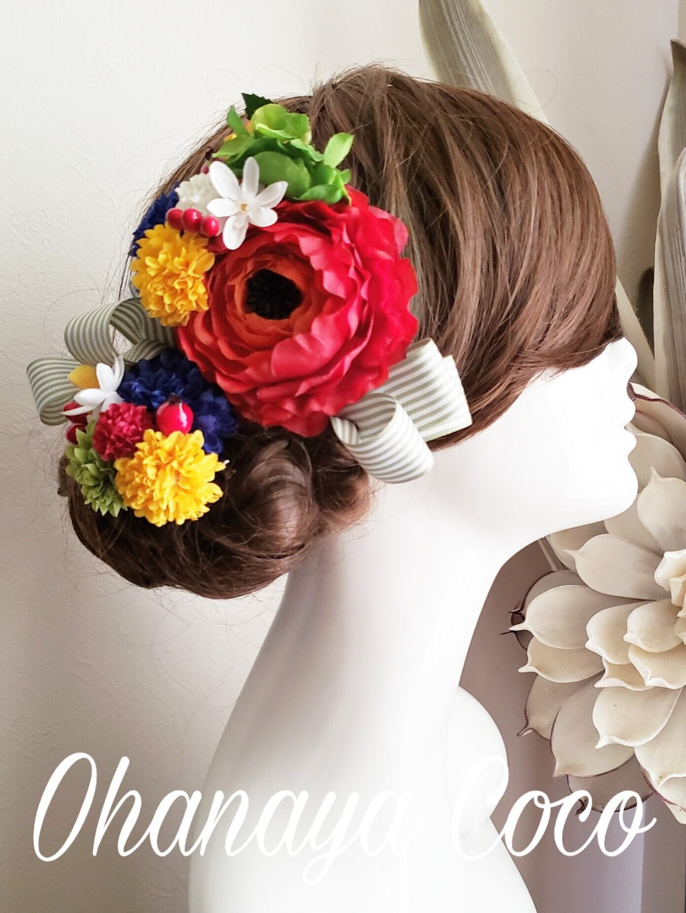 ハッキリした色合いの振袖、浴衣、袴など和風モダン系にもピッタリです。付属のリボンで雰囲気を変える事も出来ます。