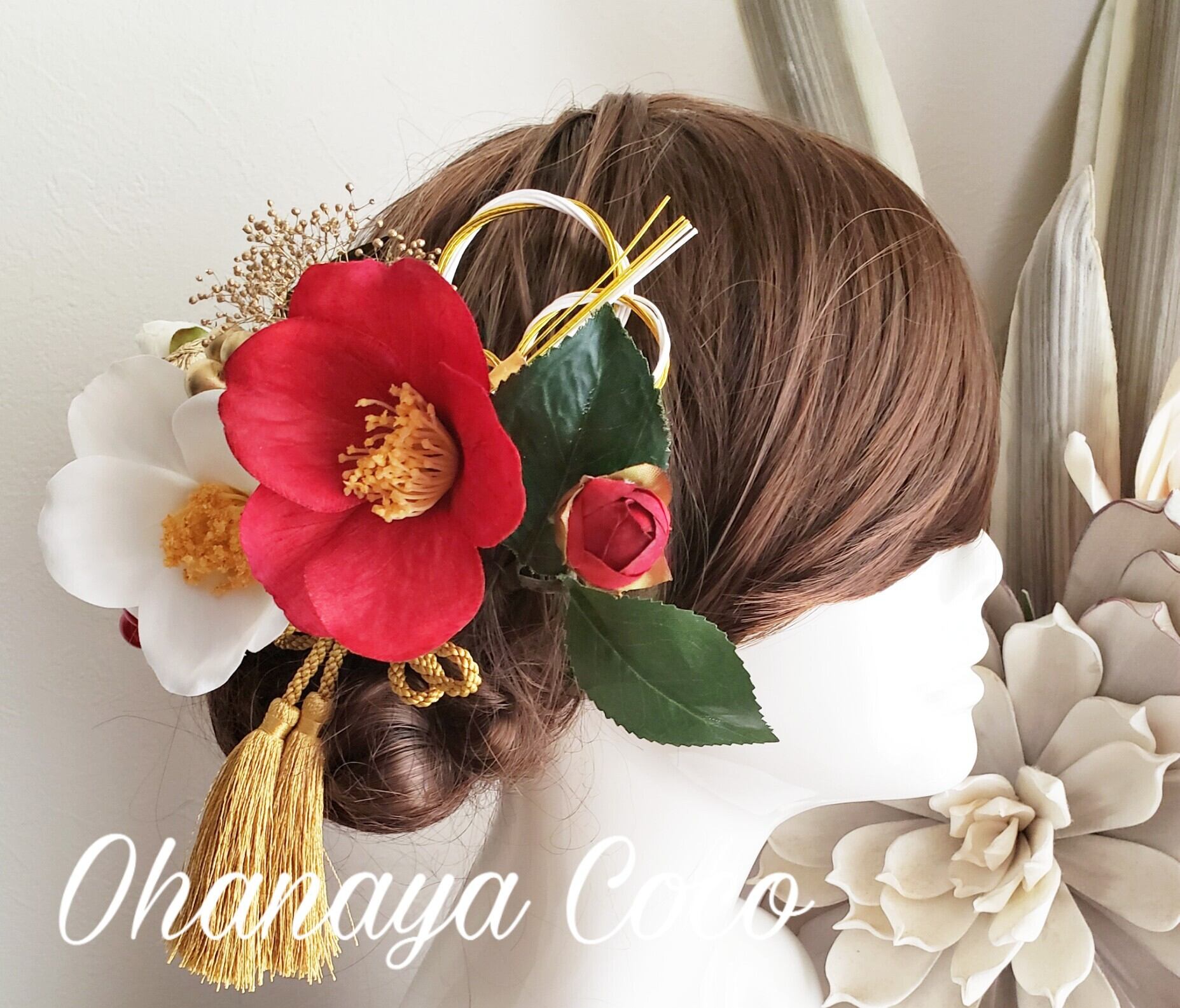花雅 真っ赤な江戸椿と真っ白江戸椿の水引髪飾り14点Setです。