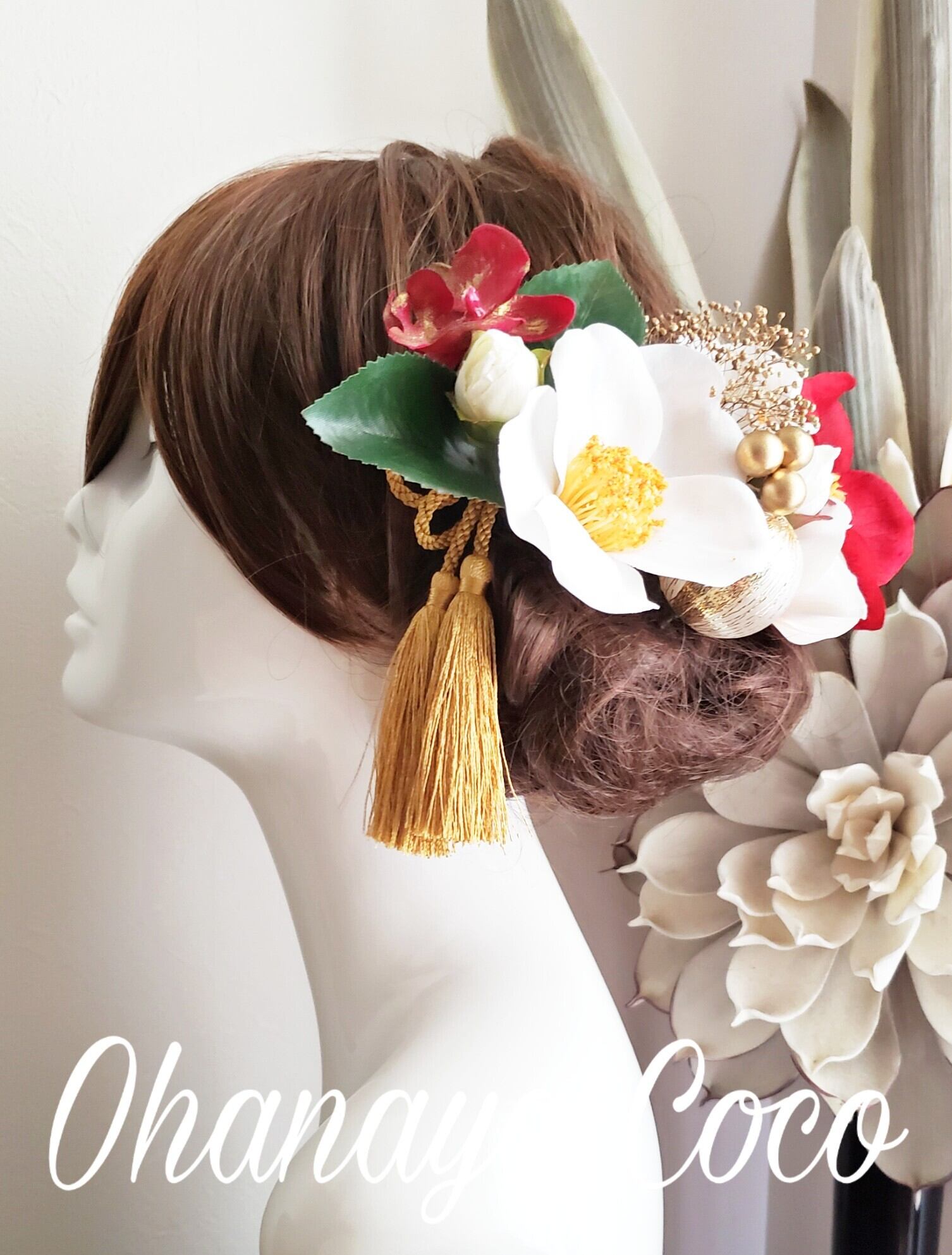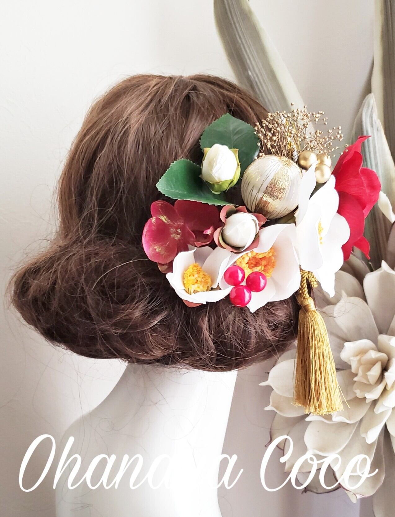 お花は撮影角度などにより大きく見える場合もありますので実際の髪飾りの大きさは記載のサイズをご確認下さいませ。