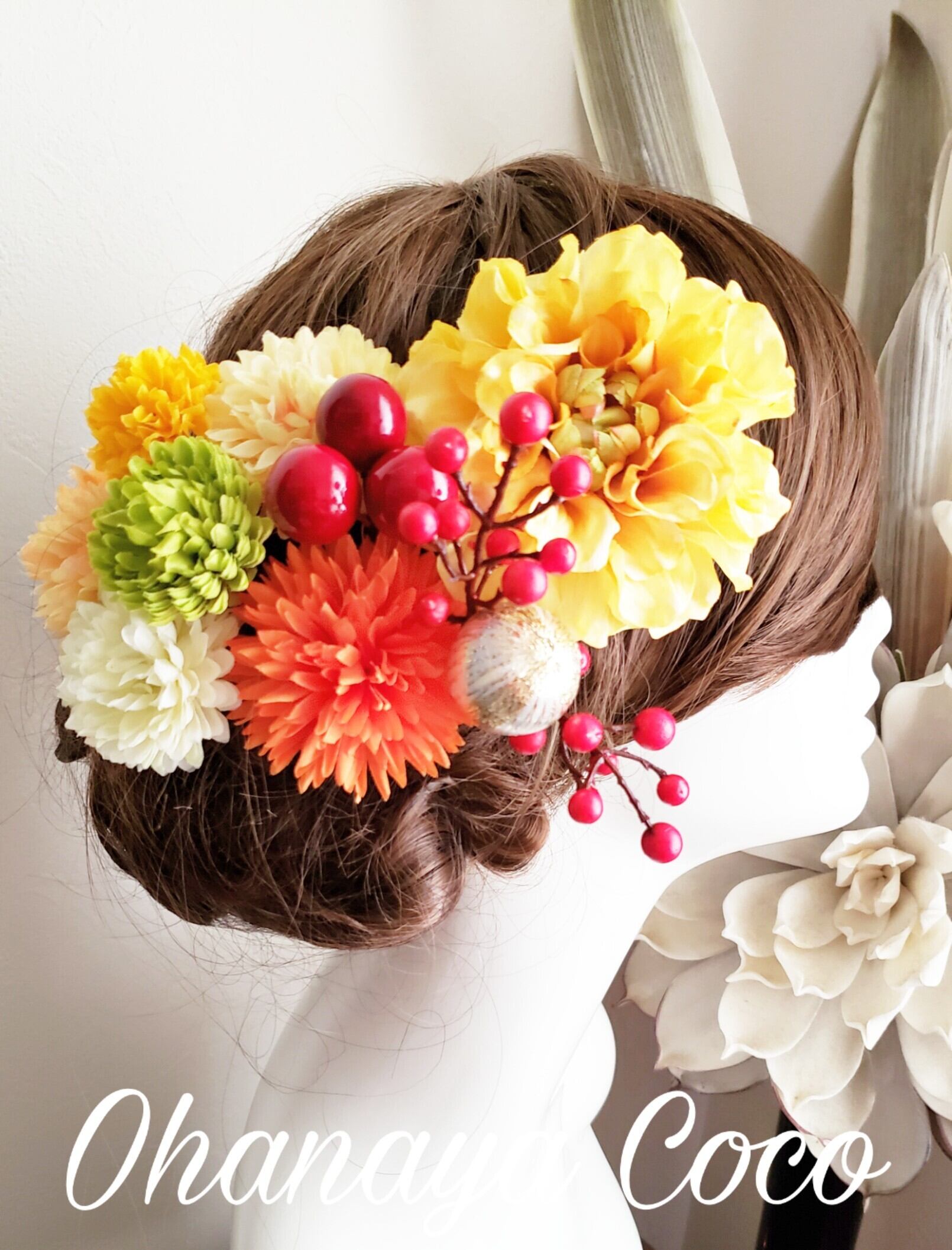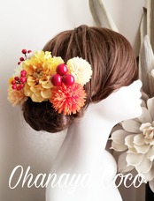 こちらの商品は花kirari マスタード色のダリアとマムの髪飾り11点Setです。