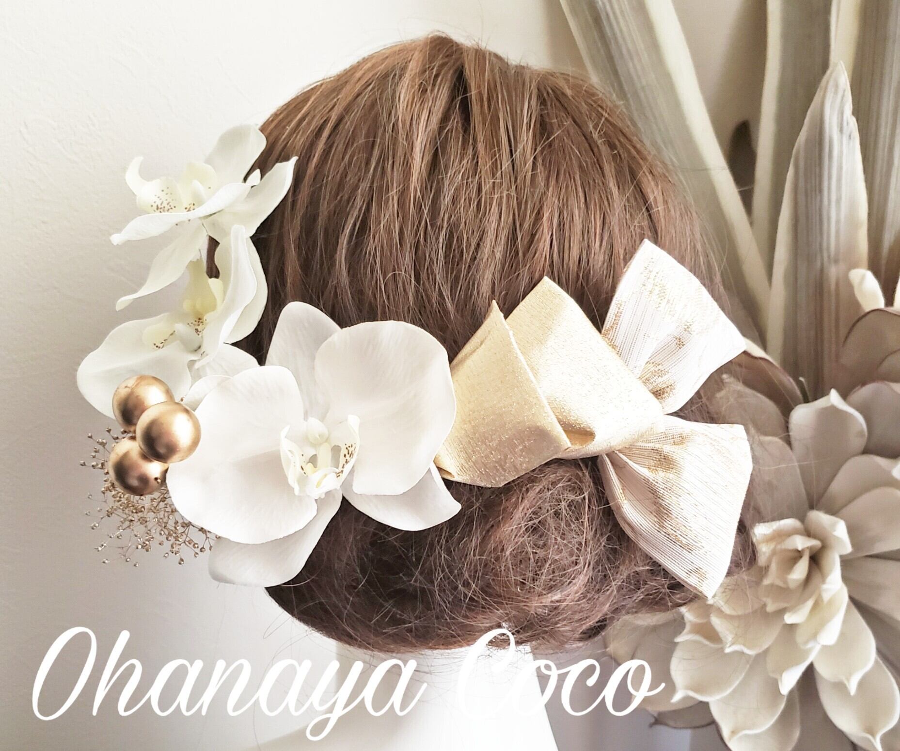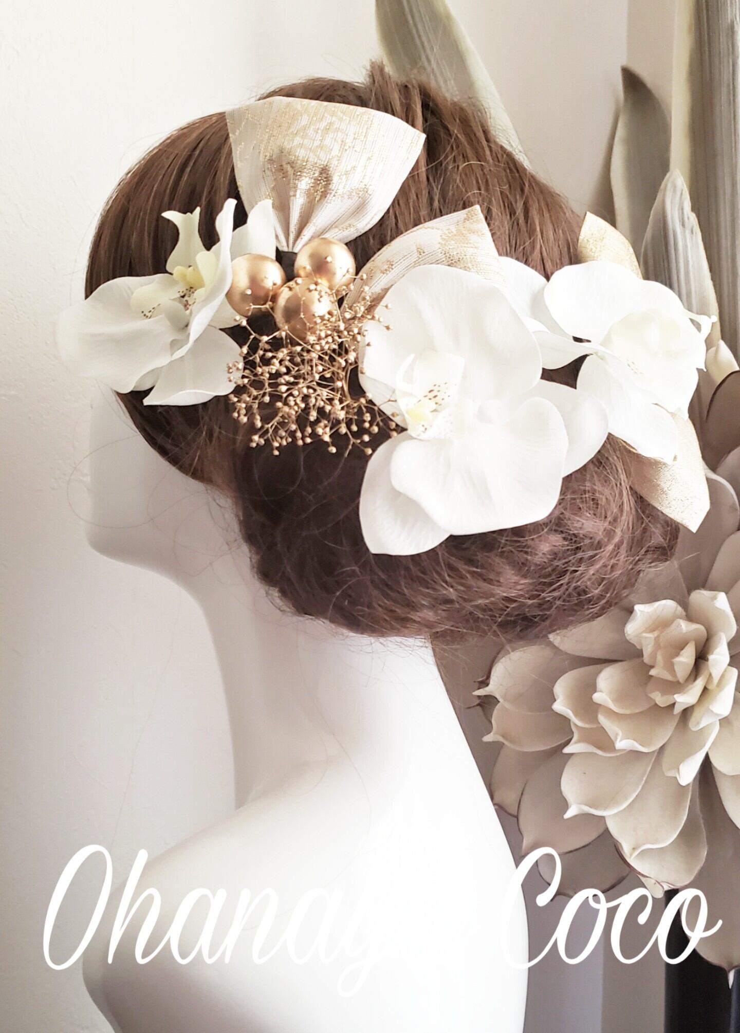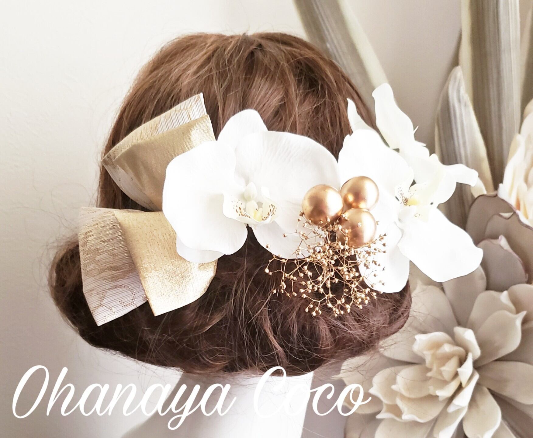 こちらの商品は hirara蝶舞う 胡蝶蘭と銀杏リボンの髪飾り9点Setです。