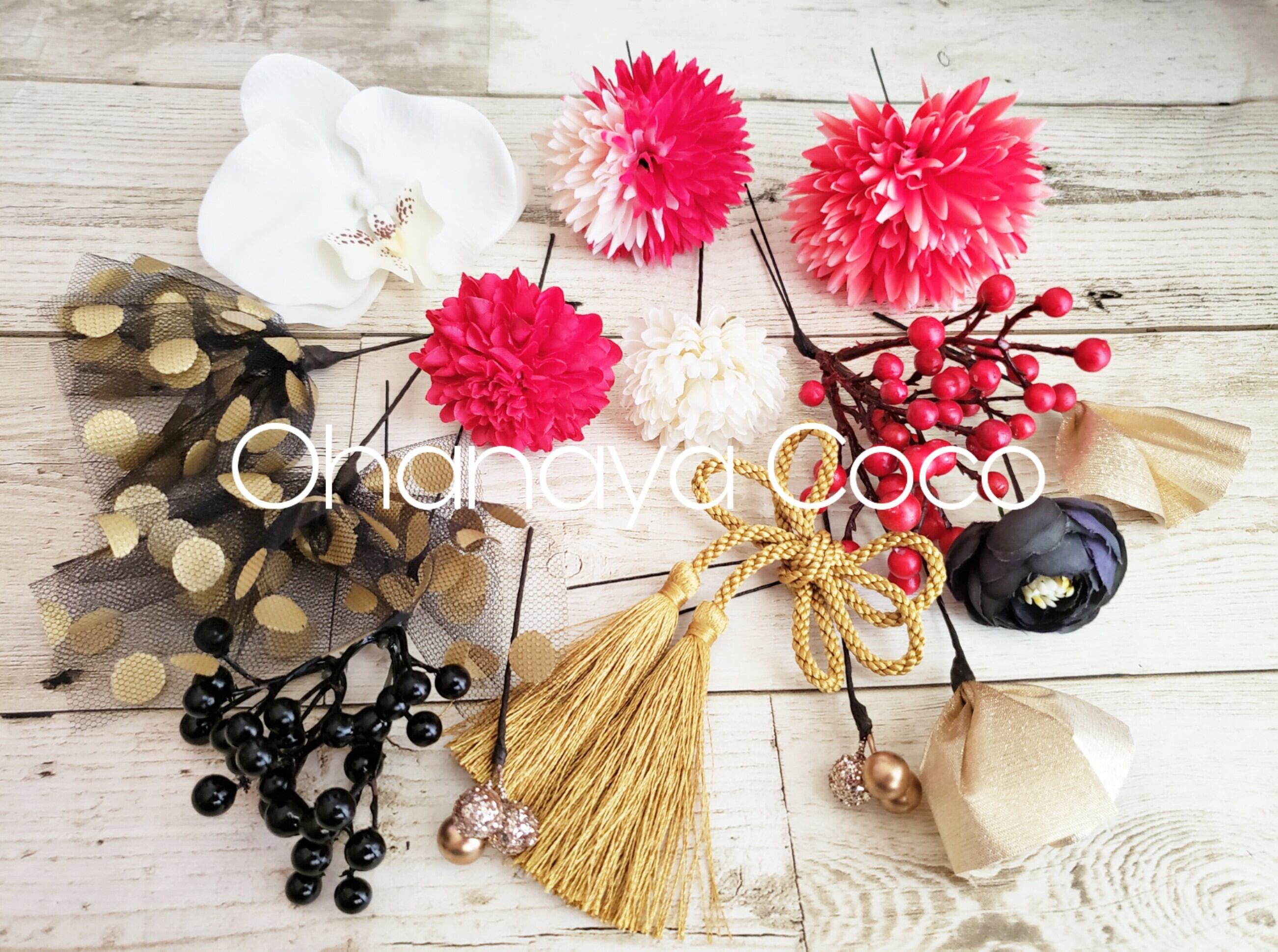 こちらの商品は花hirari 赤と黒の髪飾りドットチュール14点Setです。